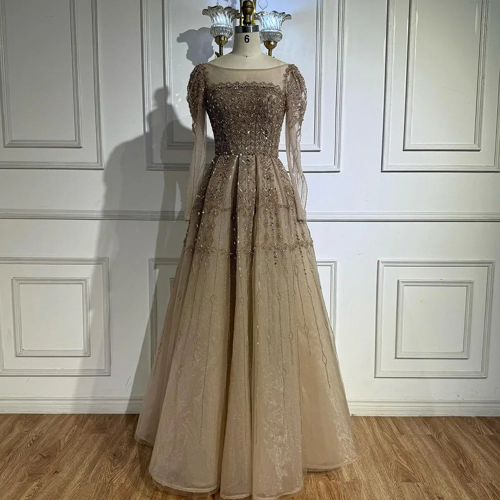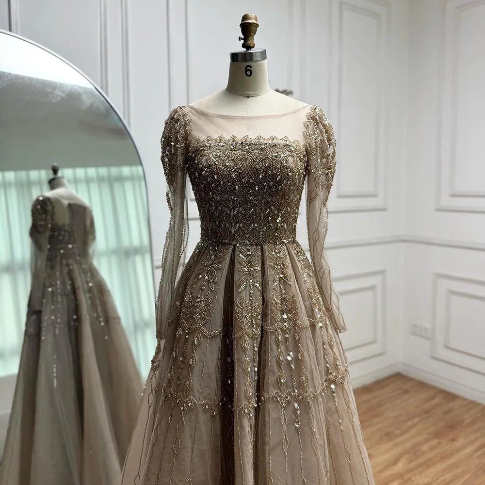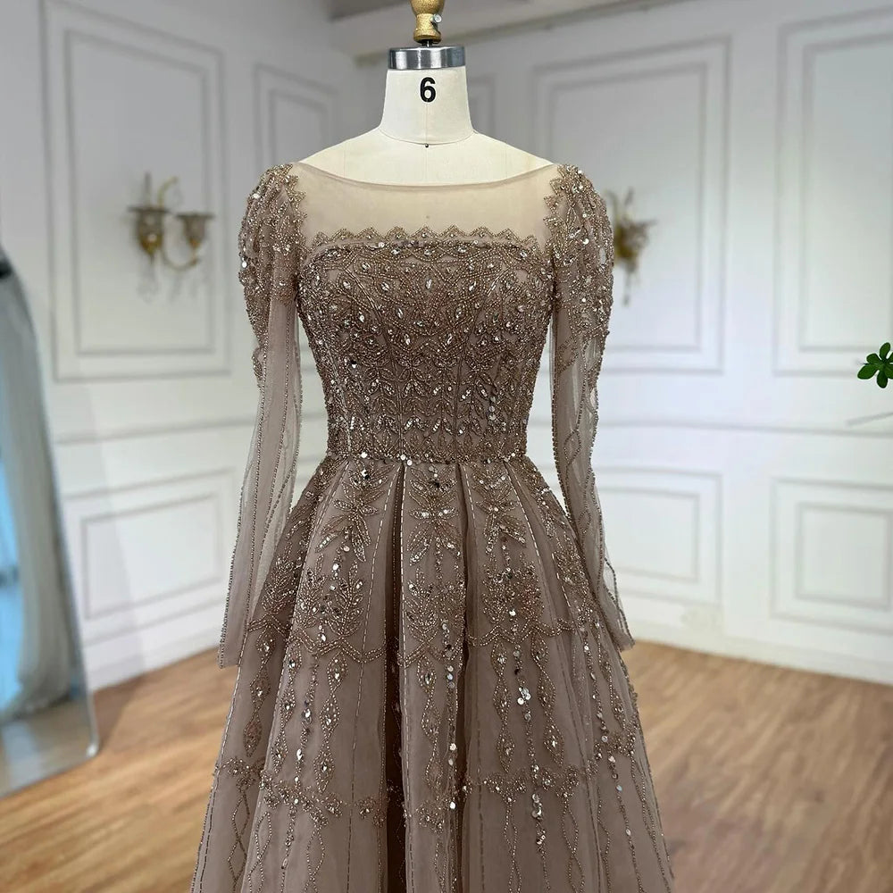 Luxury Caramel A-Line Beaded Evening Dress with Long Sleeves LA73077