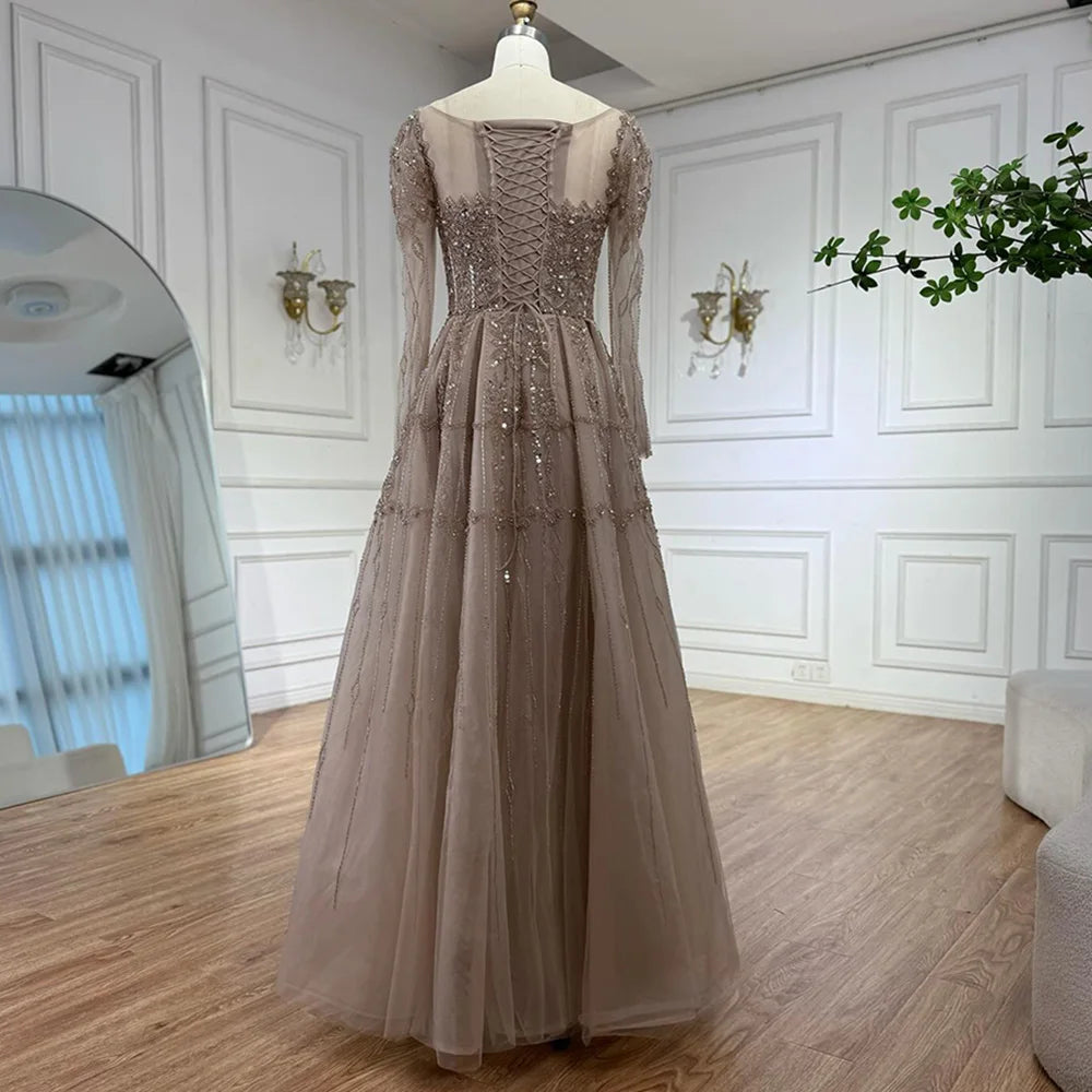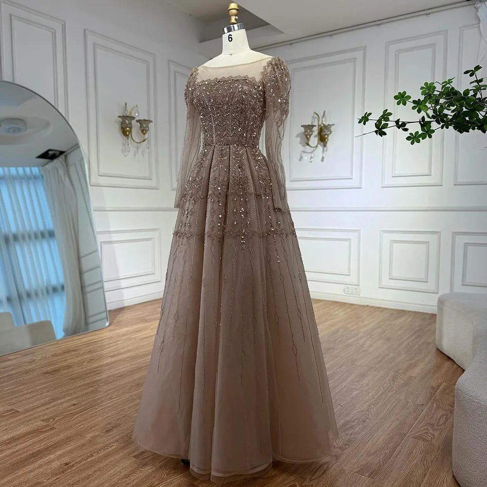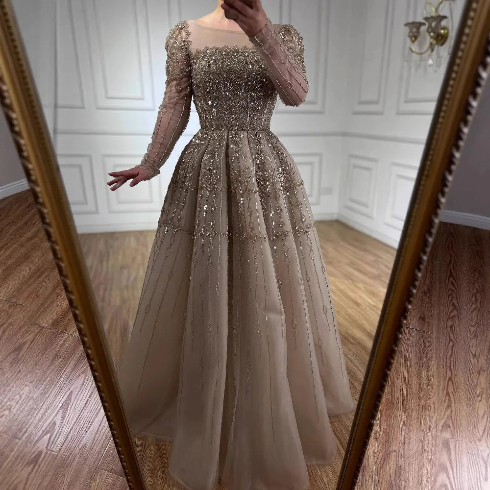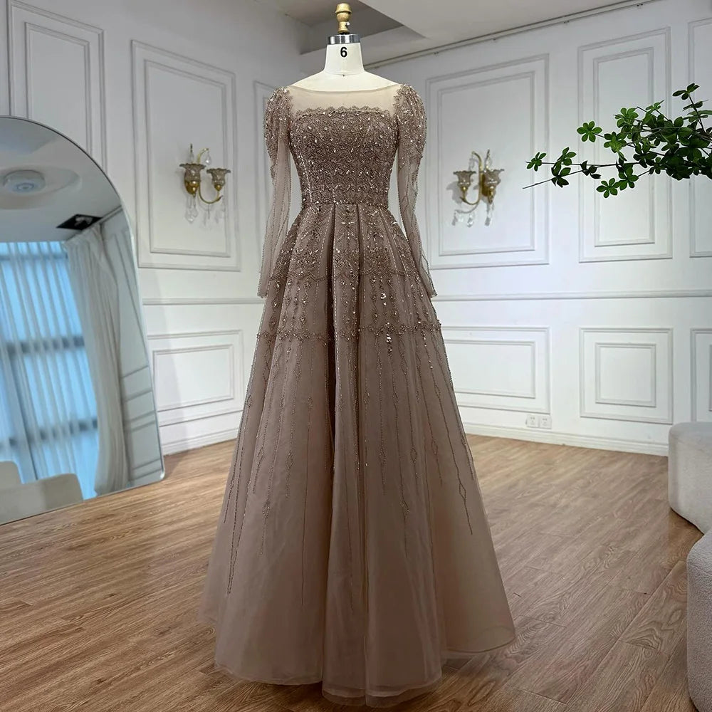 Luxury Caramel A-Line Beaded Evening Dress with Long Sleeves LA73077