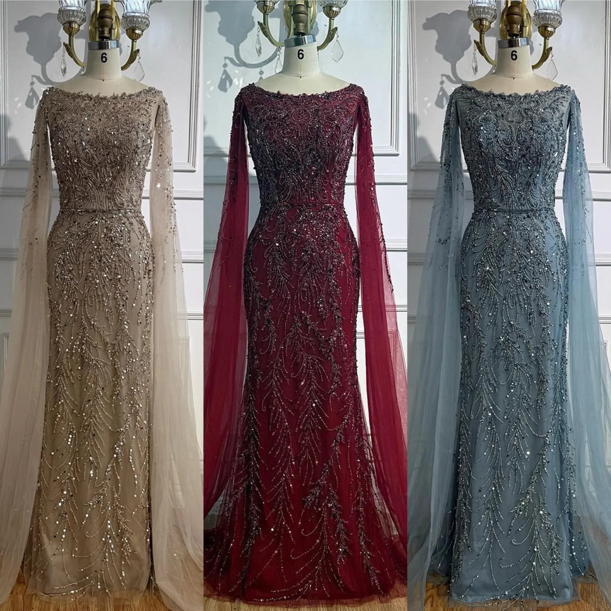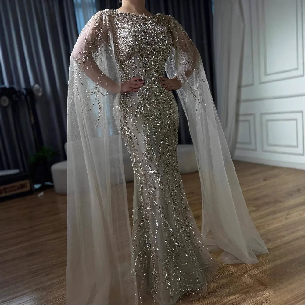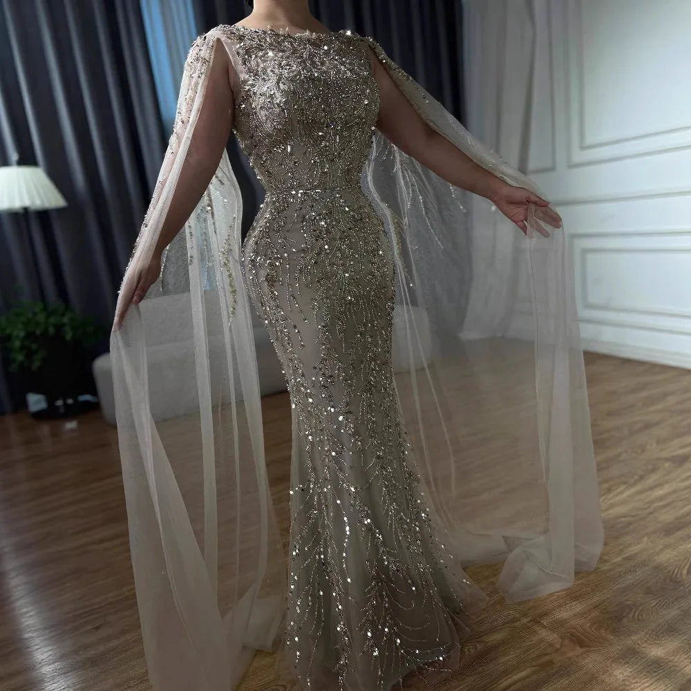 This caramel beaded evening dress features elegant cape sleeves and a classic boat neck. A fitted silhouette makes it ideal for weddings, galas, and formal parties.