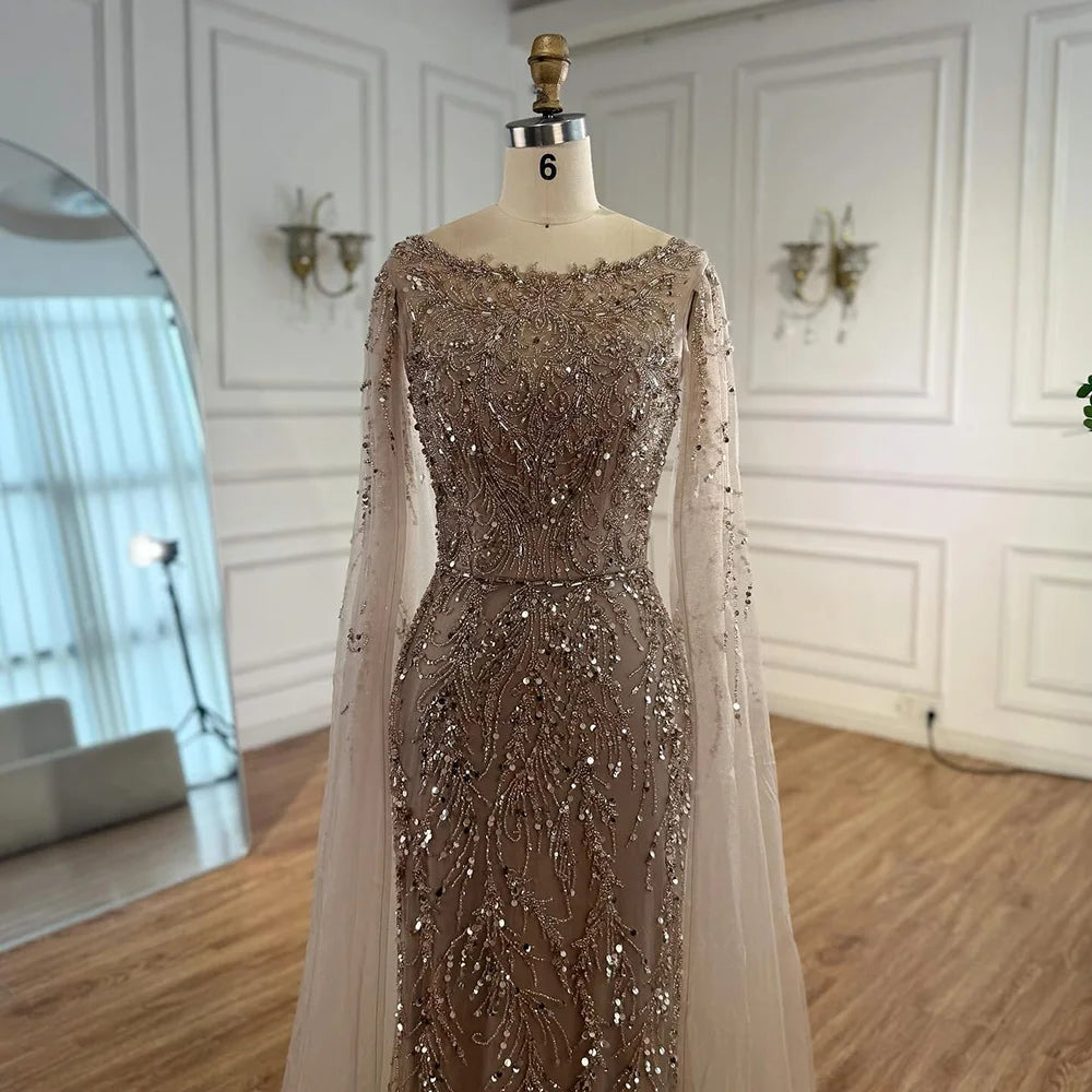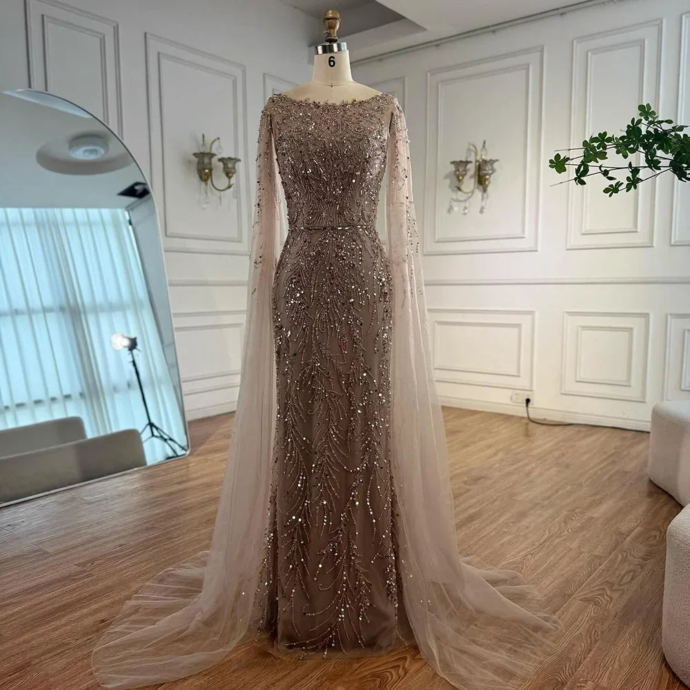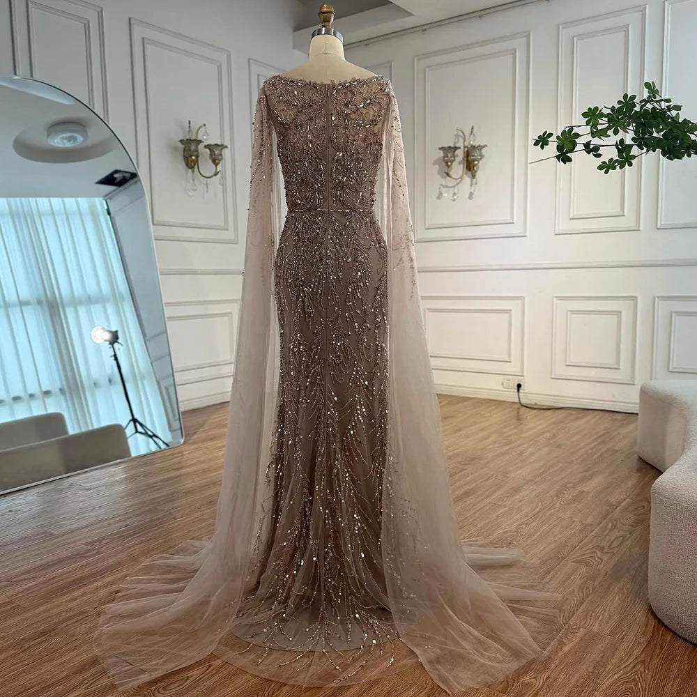 Luxury Caramel Beaded Evening Dress with Cape Sleeves LA73078