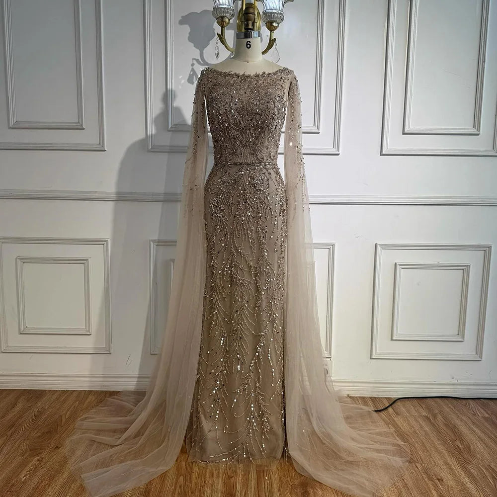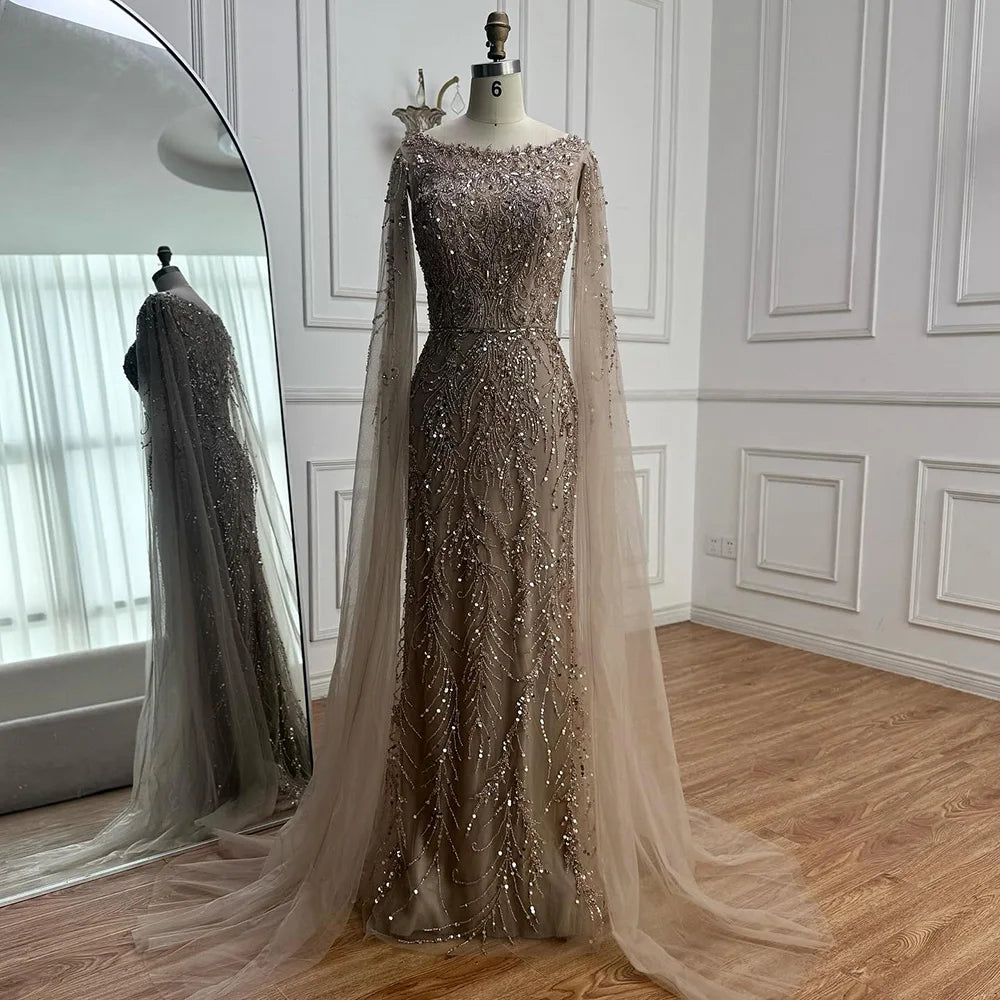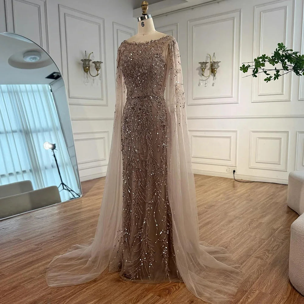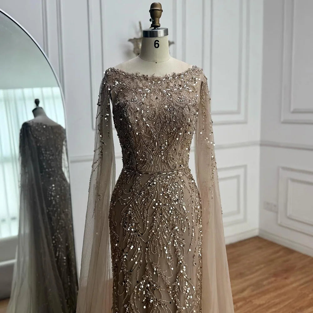 Luxury Caramel Beaded Evening Dress with Cape Sleeves LA73078