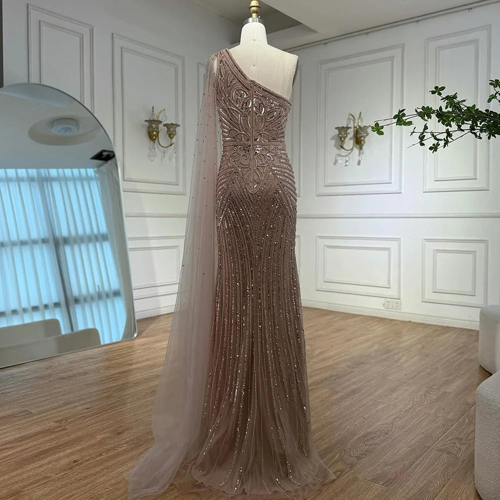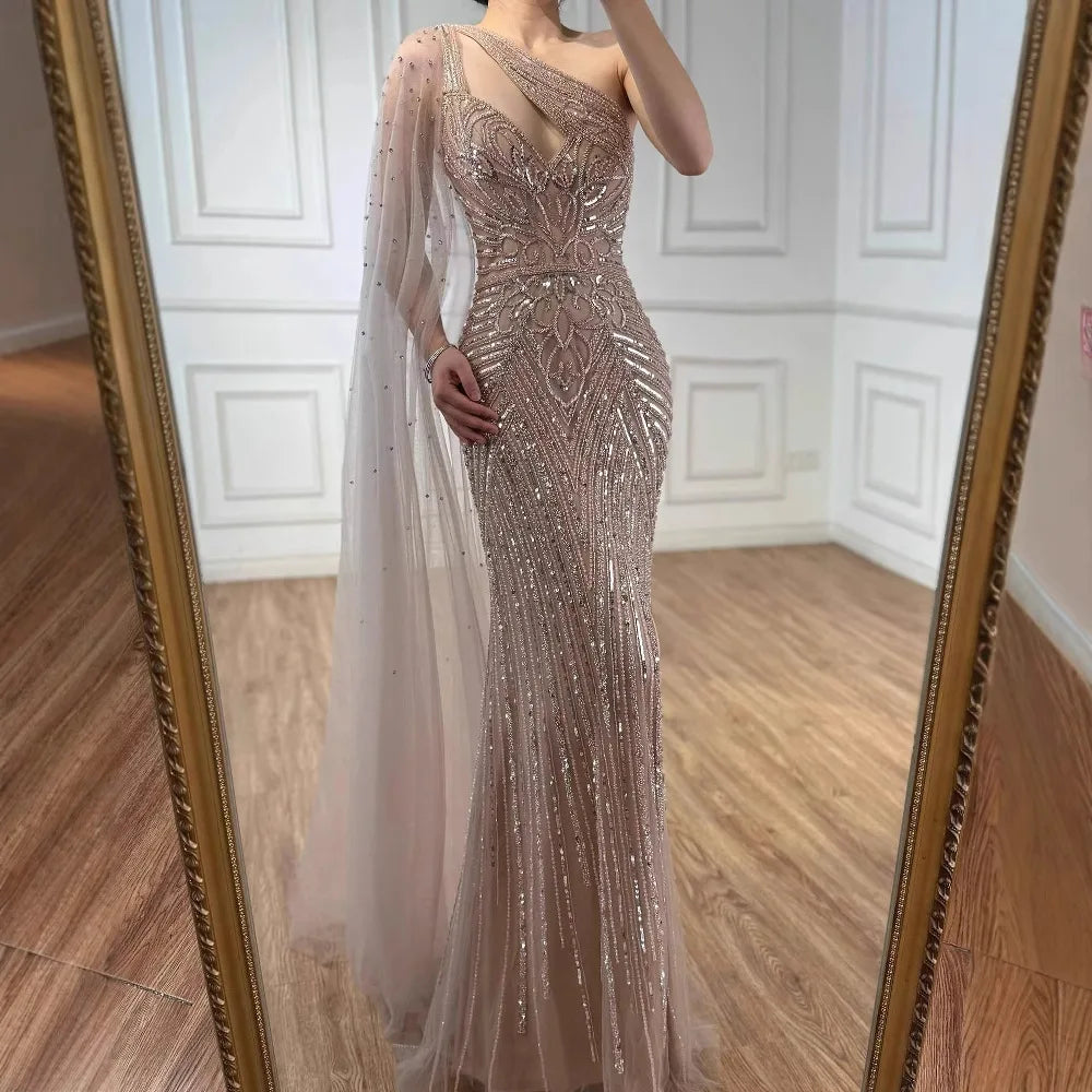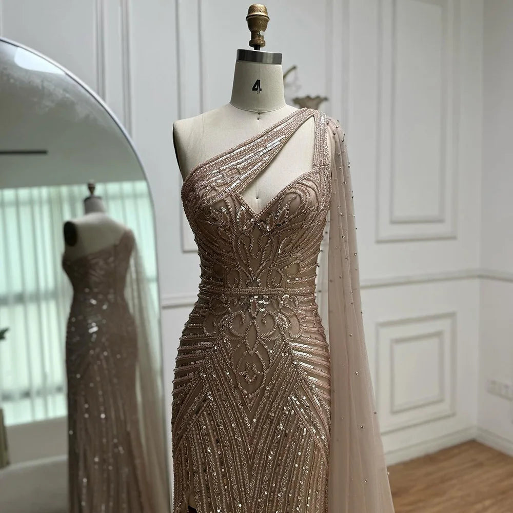 Luxury Caramel Beaded Mermaid Evening Dress with One Shoulder Cape LA73085
