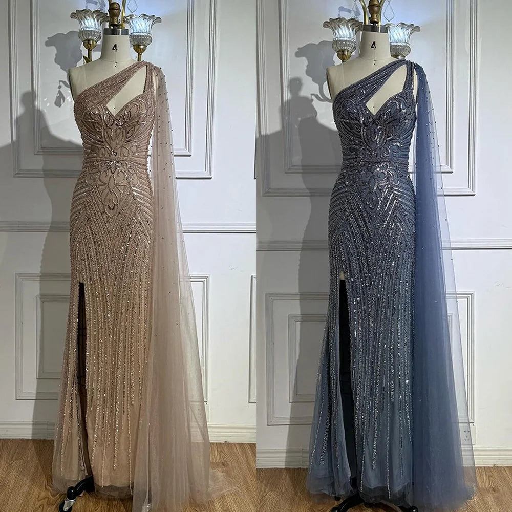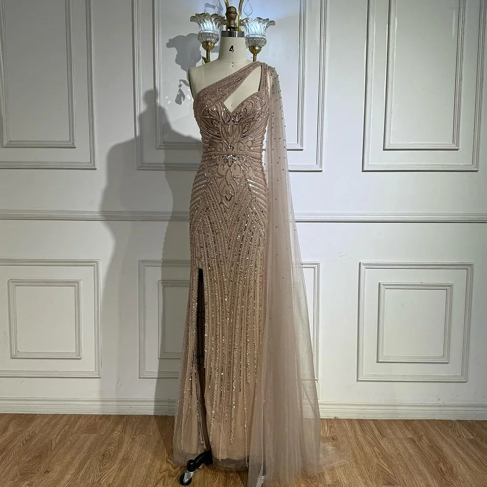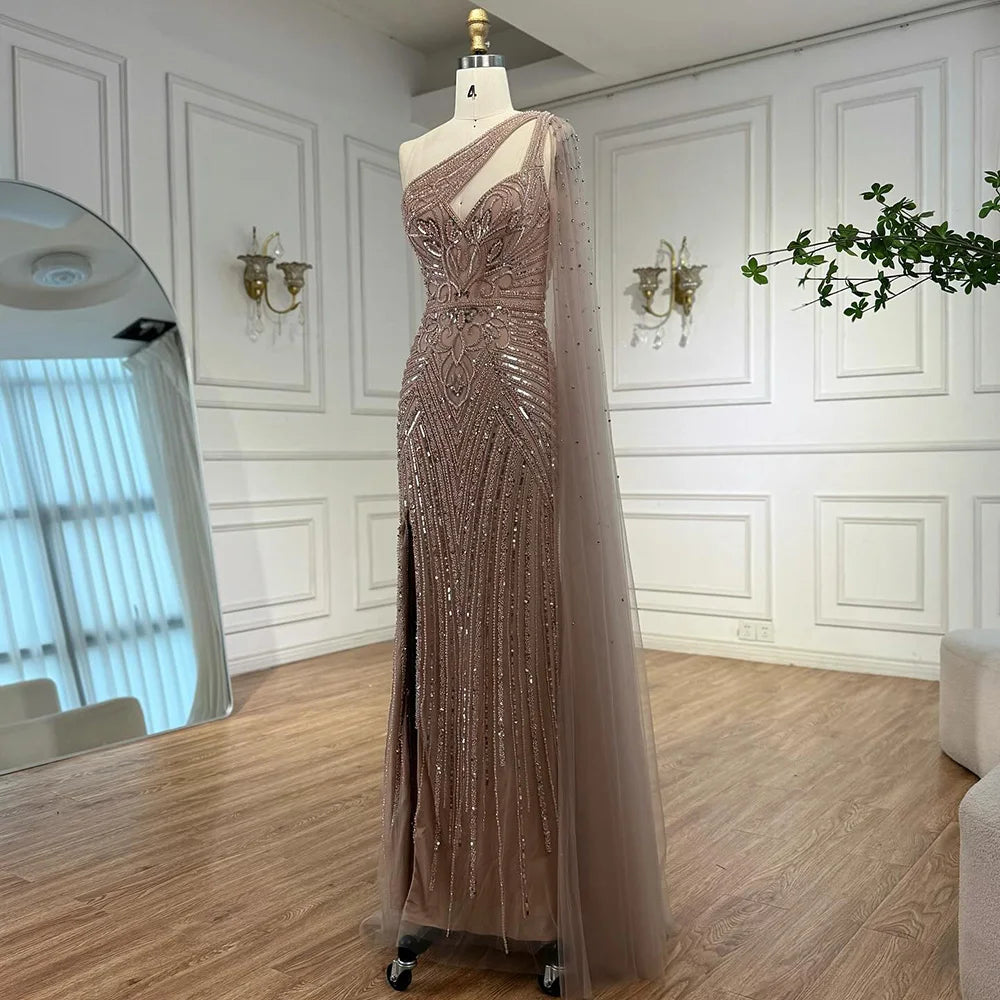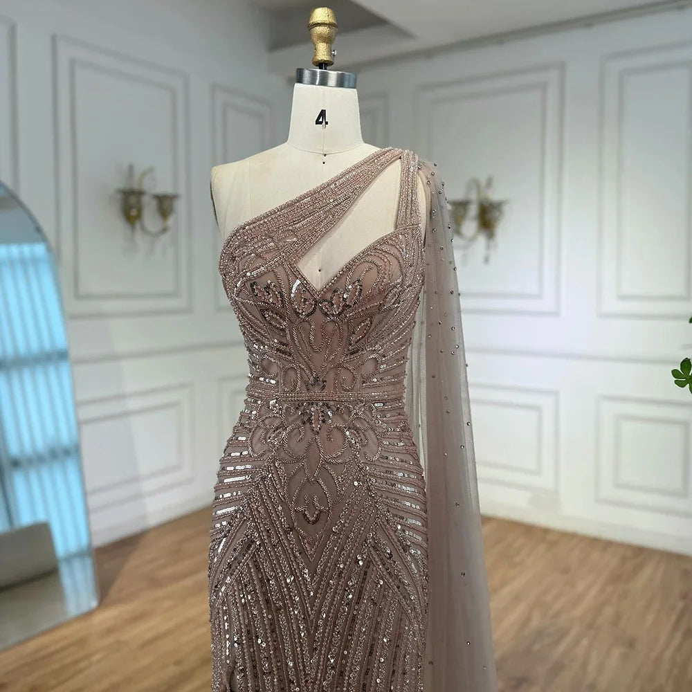 Luxury Caramel Beaded Mermaid Evening Dress with One Shoulder Cape LA73085