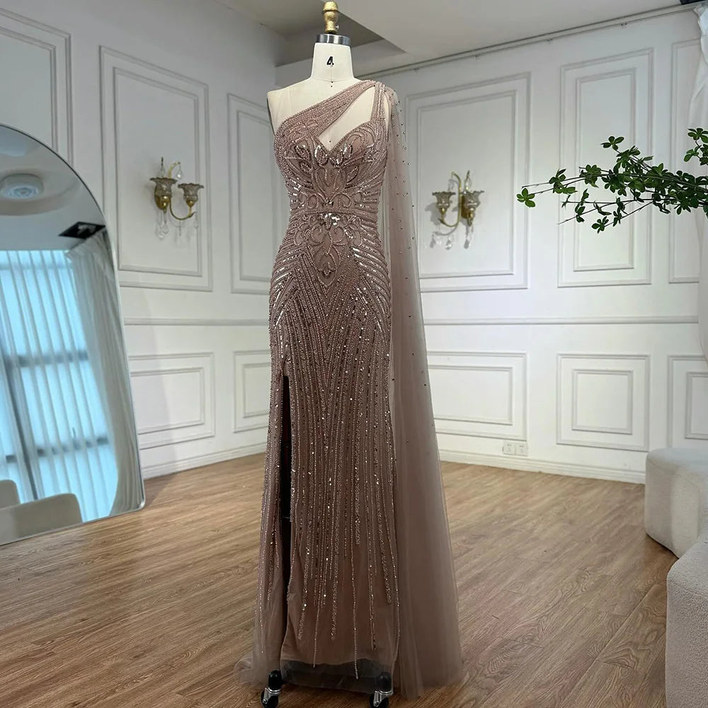 Elegant caramel one-shoulder mermaid evening dress with crystal beading, cape sleeve, and thigh-high slit. A refined statement look for formal occasions.