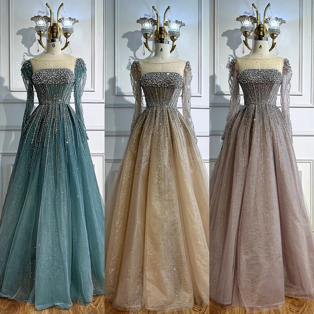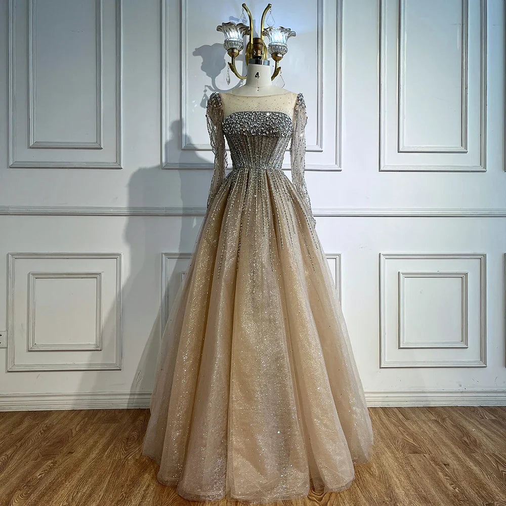 Luxury Caramel Sparkly A-Line Evening Dress with Long Sleeves LA72991