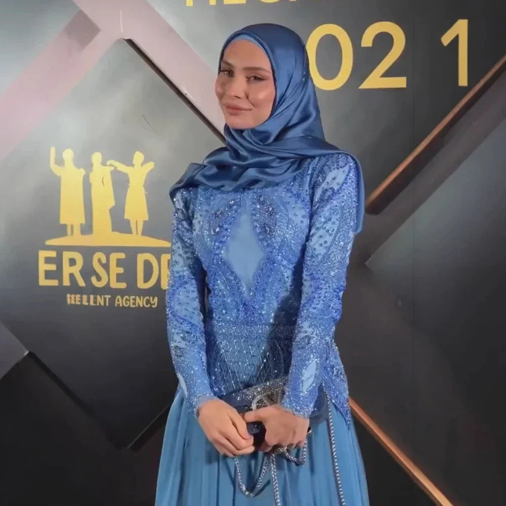 Luxury Designer Blue Beaded Evening Dress with Long Sleeves LA72962