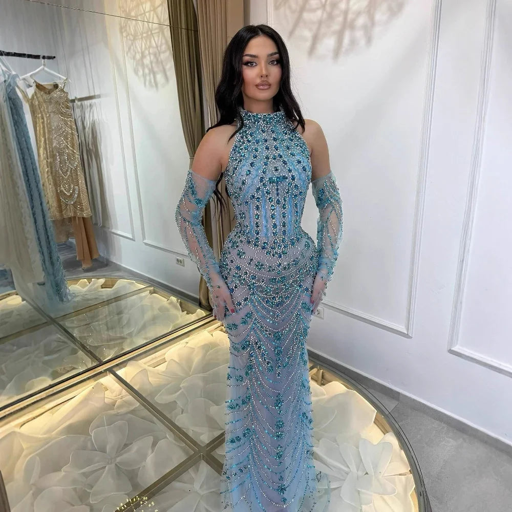Luxury Dubai Arabic Blue Beaded Evening Dress with Gloves LA72760A