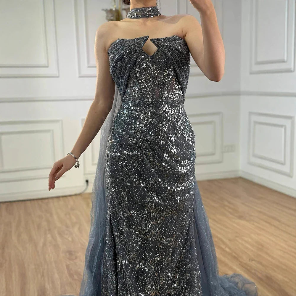 Luxury Gray Beaded Evening Dress with Long Cape LA73159
