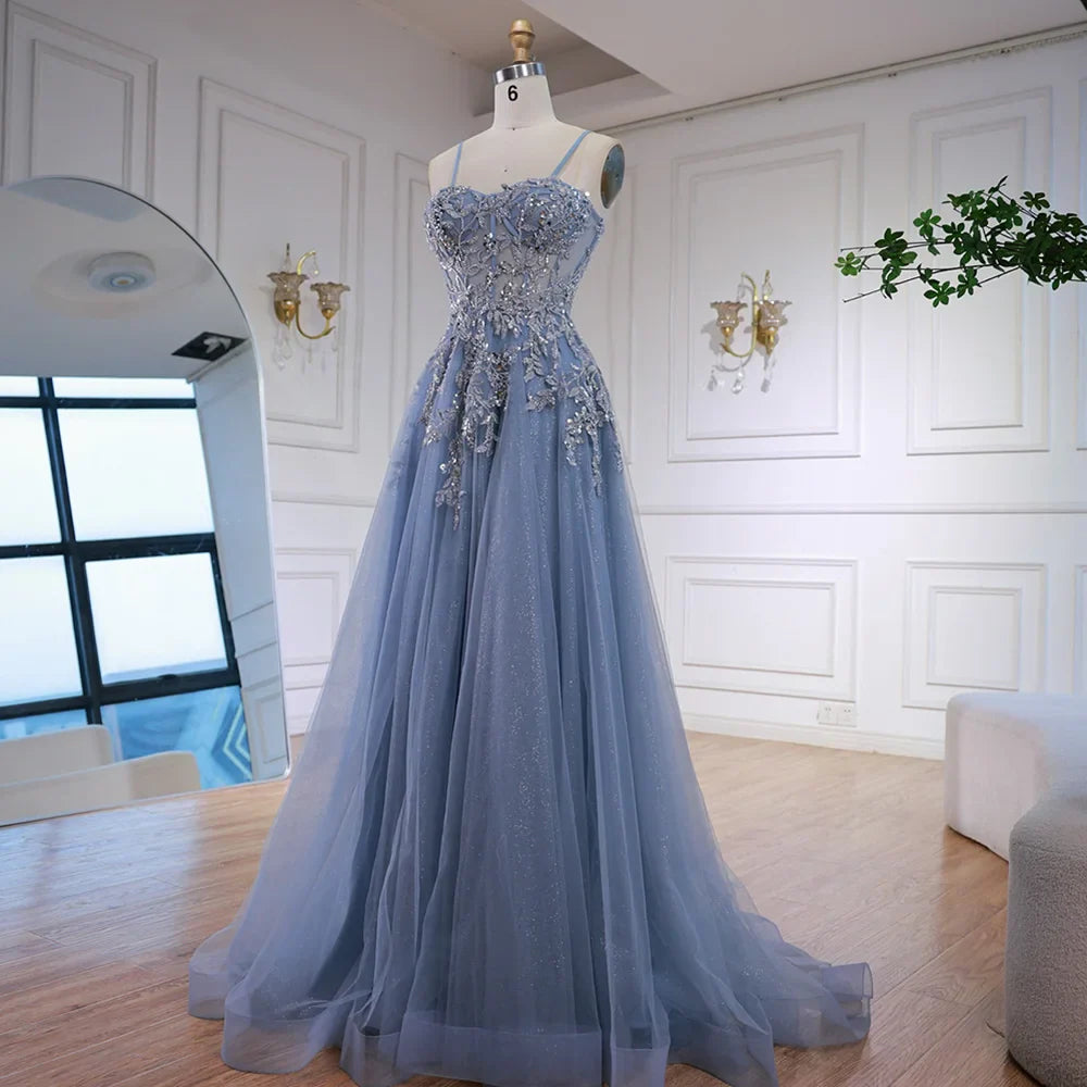 Graceful gray tulle A-line prom dress featuring floral appliques and spaghetti straps. Ideal for elegant parties, proms, and formal occasions.