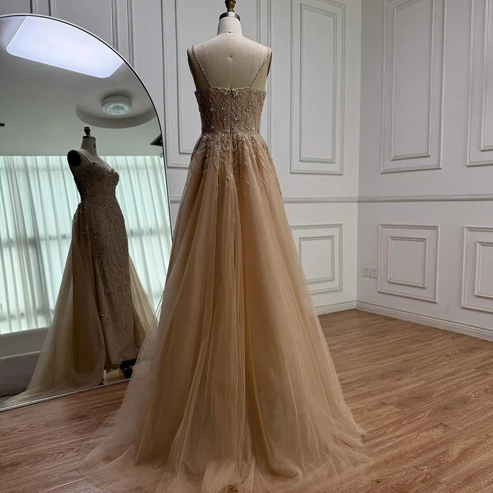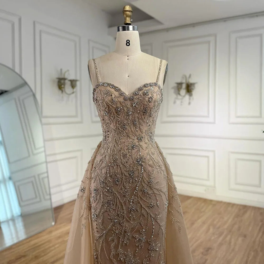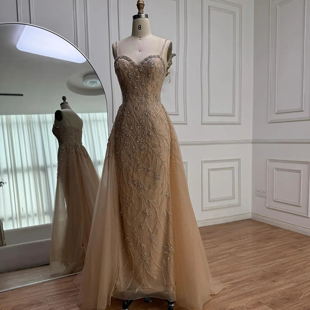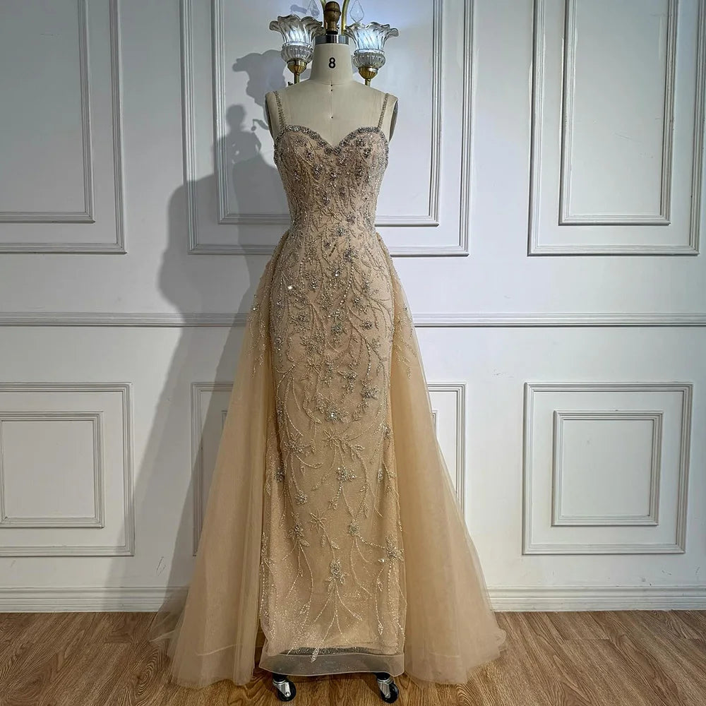 Elegant nude evening dress with spaghetti straps, shimmering beading, and a detachable overskirt. Perfect for formal events and special occasions in 2025.