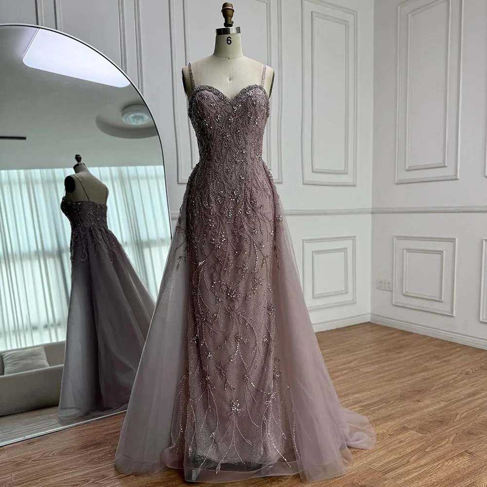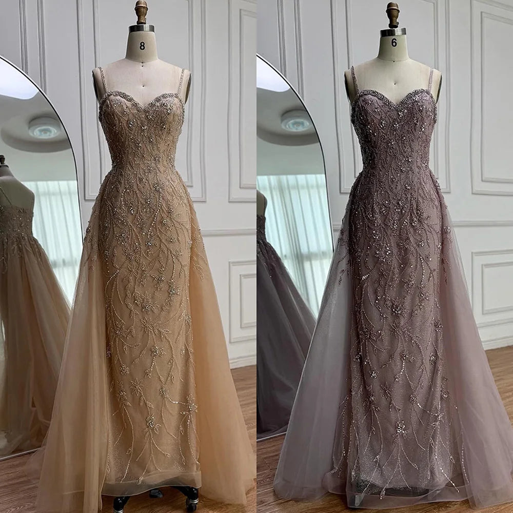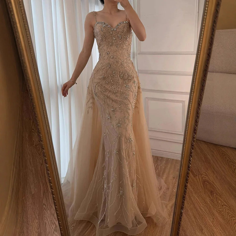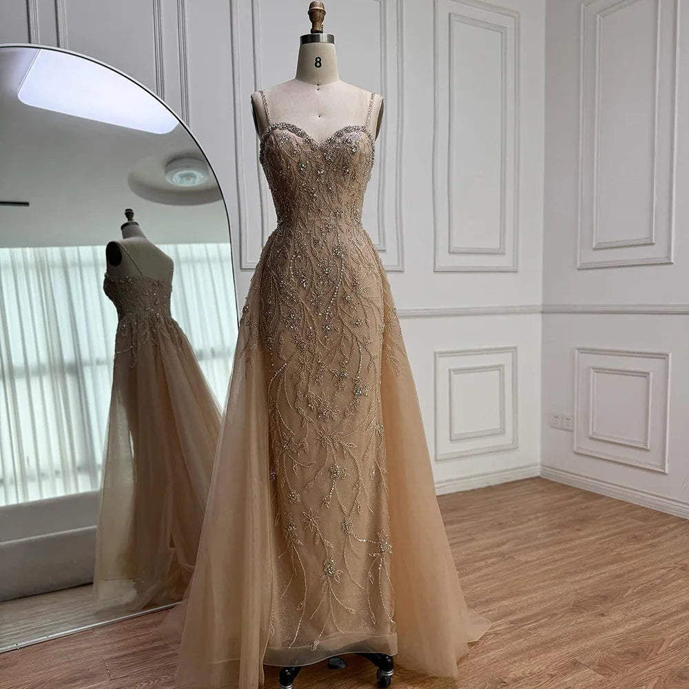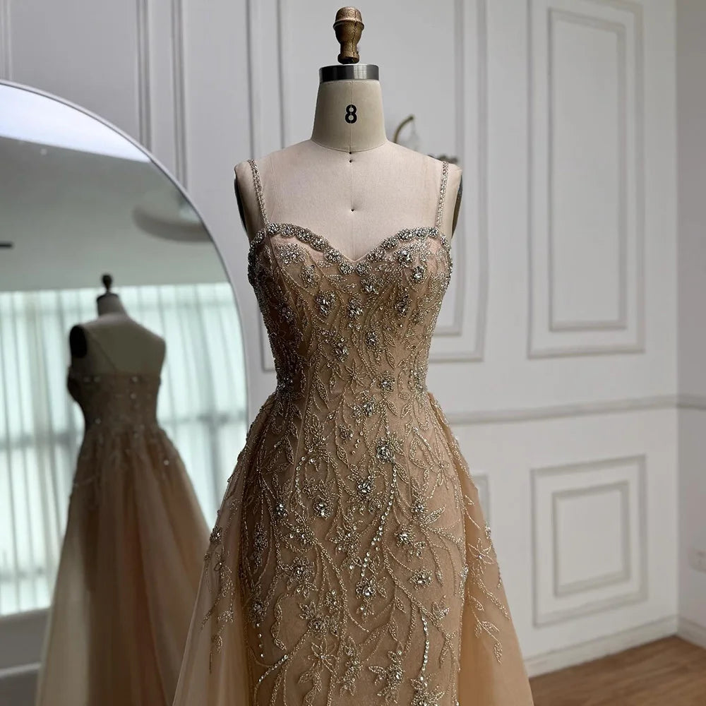 Elegant nude evening dress with spaghetti straps, shimmering beading, and a detachable overskirt. Perfect for formal events and special occasions in 2025.