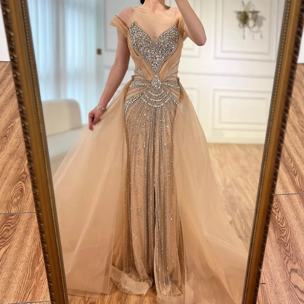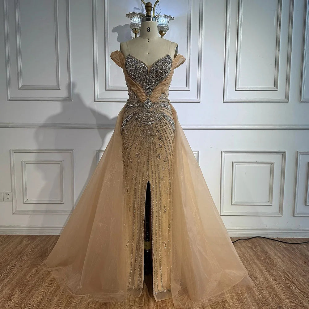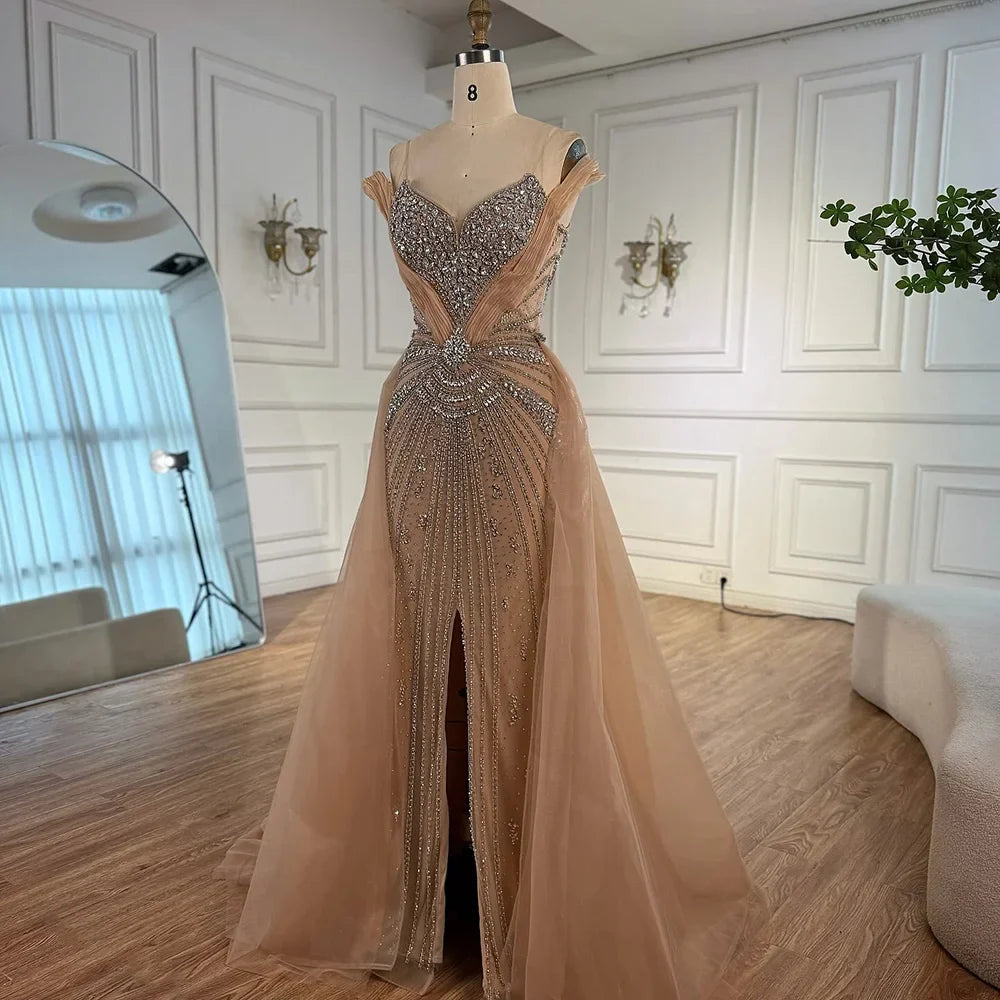 Elegant nude mermaid evening dress with sparkling beadwork, dramatic overskirt, and front slit. A refined design perfect for formal events or red carpets.