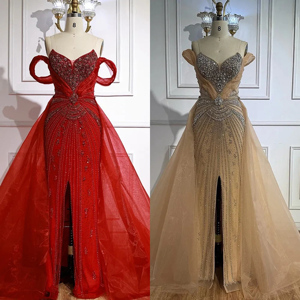 Luxury Nude Beaded Mermaid Evening Dress with Overskirt and Slit LA73034