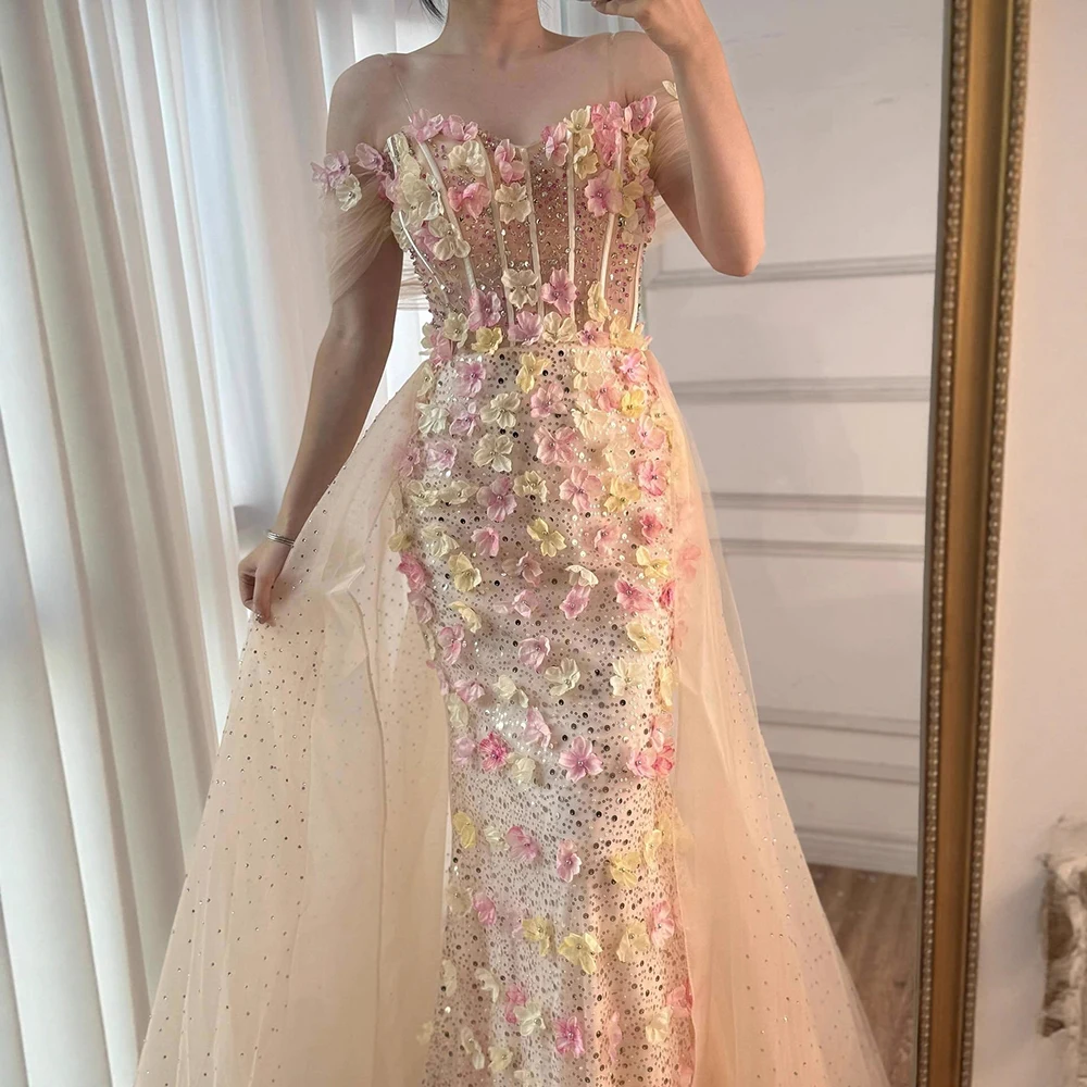 Luxury nude floral beaded off-shoulder corset evening dress LA72861 with detachable overskirt, perfect for weddings and formal 2025 occasions.