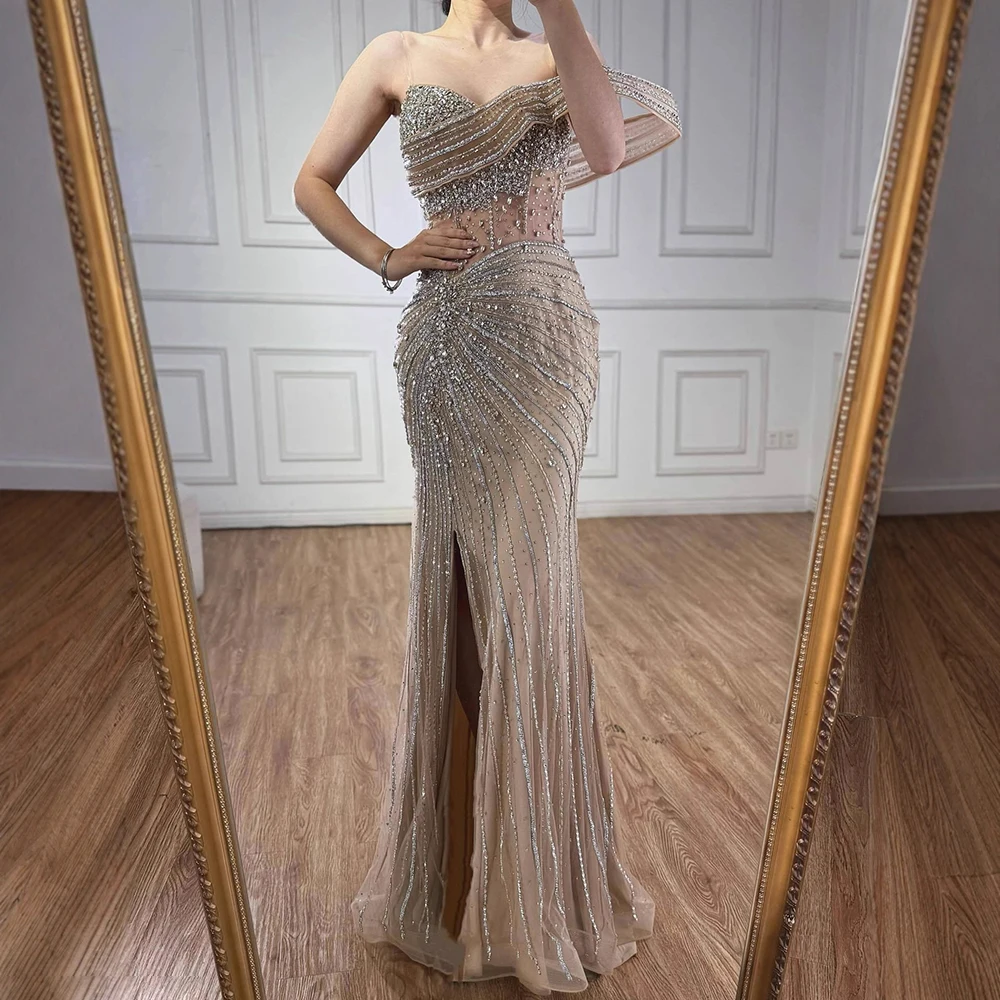 Luxury Pink Crystal One Shoulder Beaded Evening Dress Split LA73197