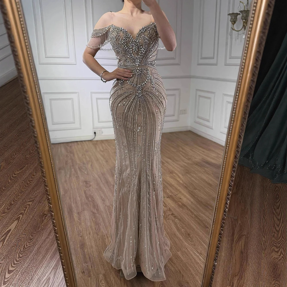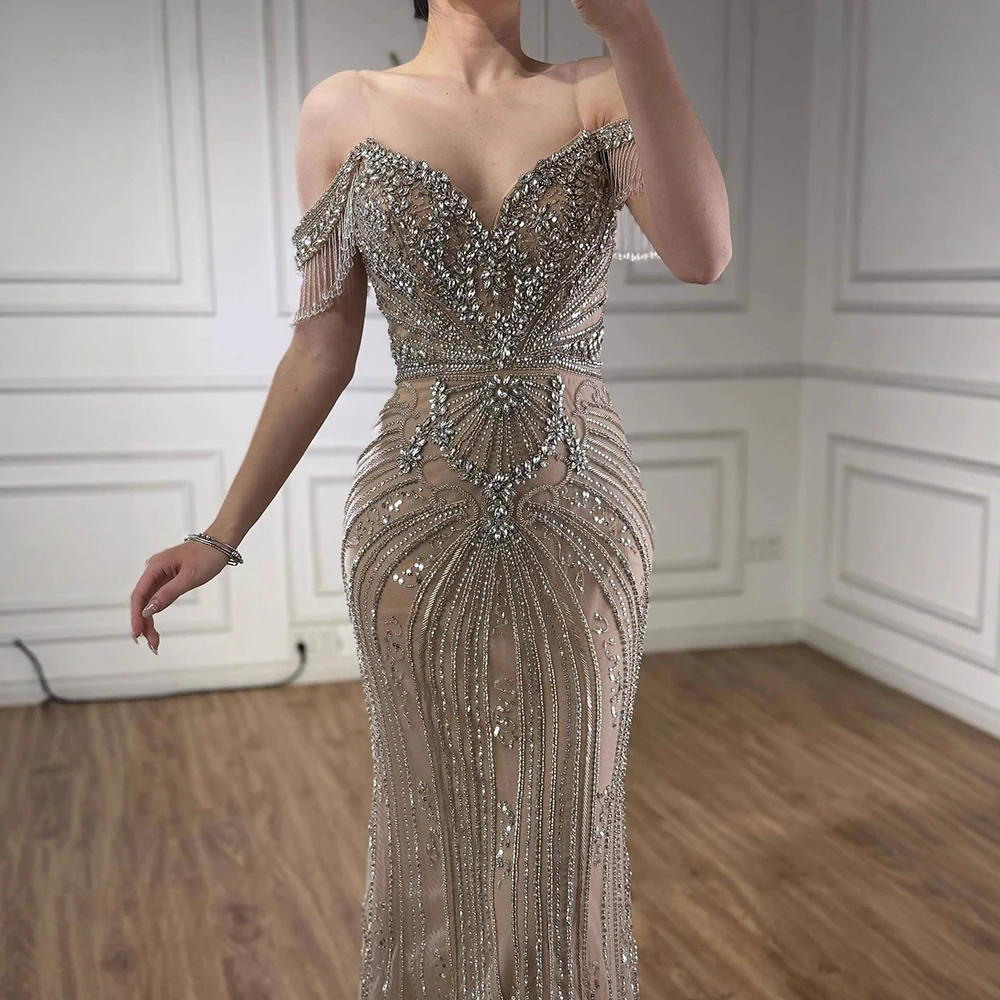 Luxury Pink Crystal Tassel Off Shoulder Evening Dress Dubai LA73204