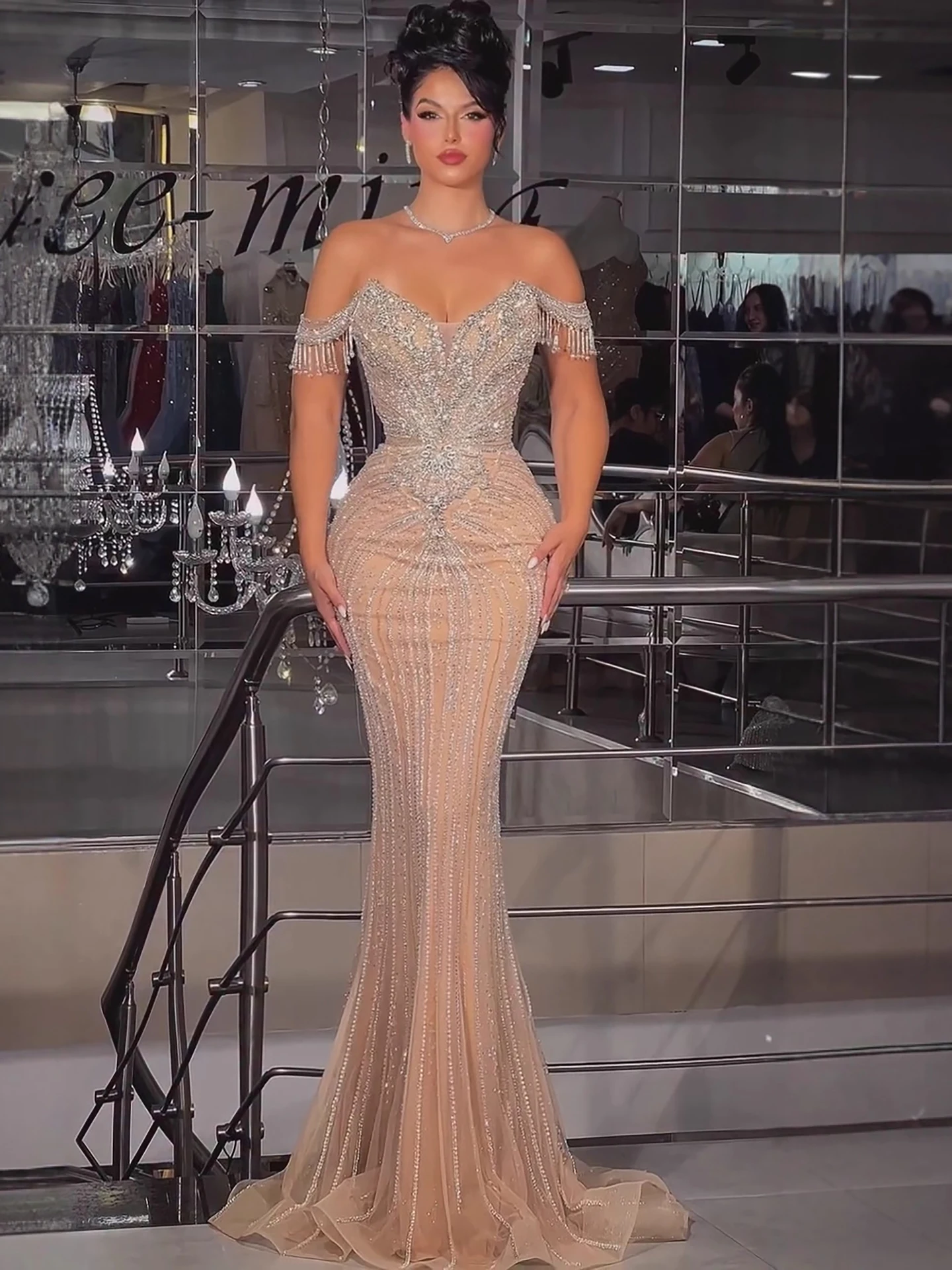 Elegant Dubai-style off-shoulder evening dress with pink tassels and crystal details. Perfect for weddings and formal parties. LA73204.