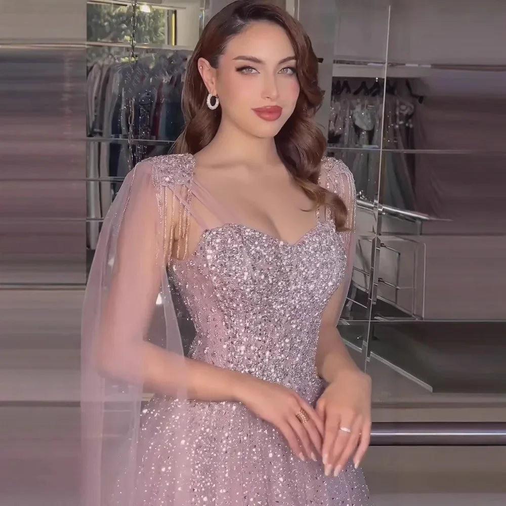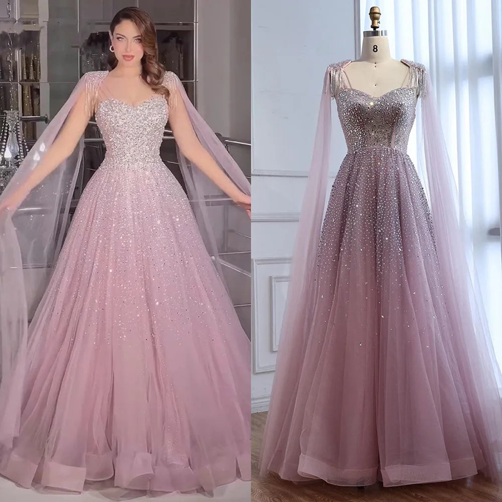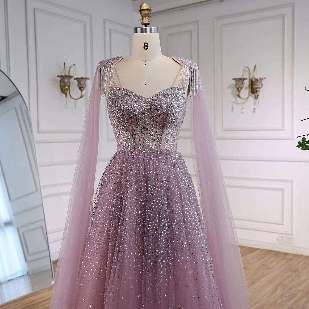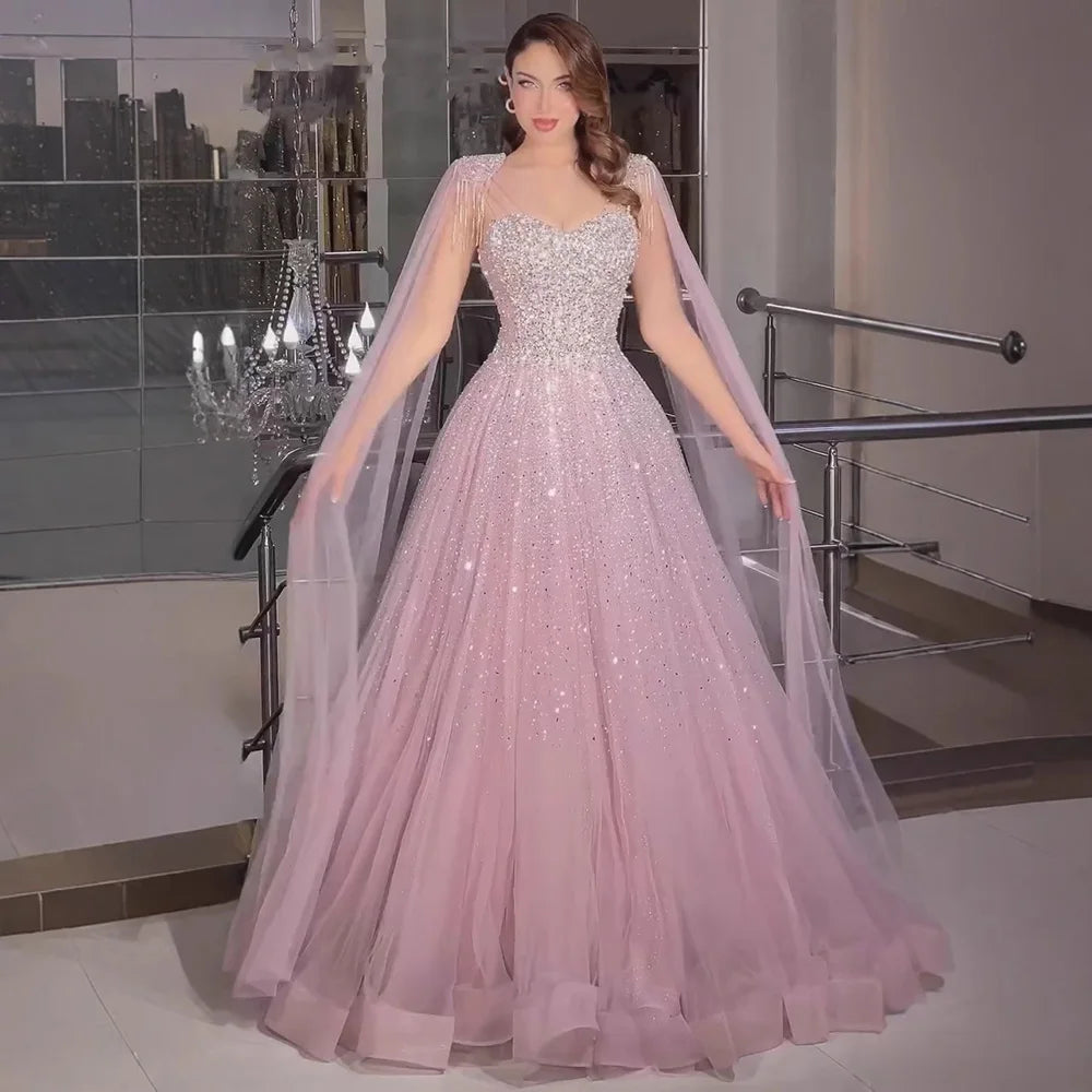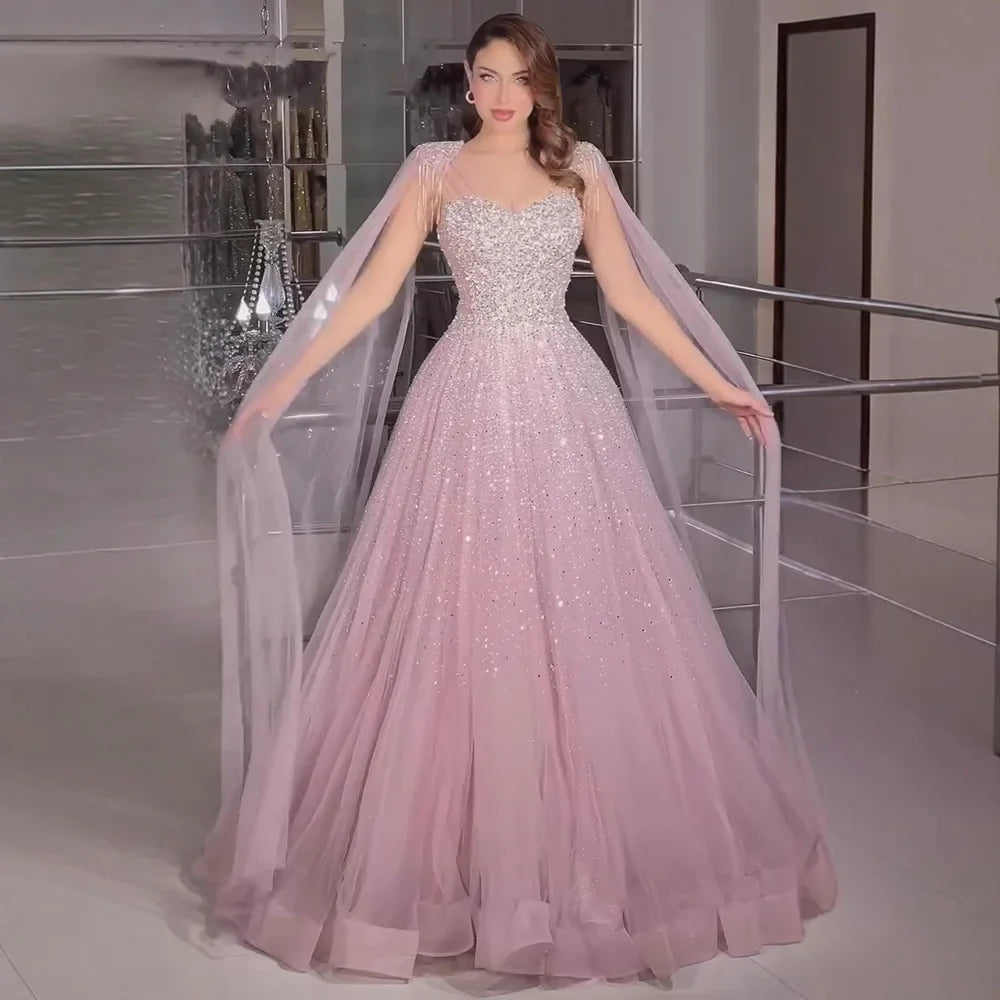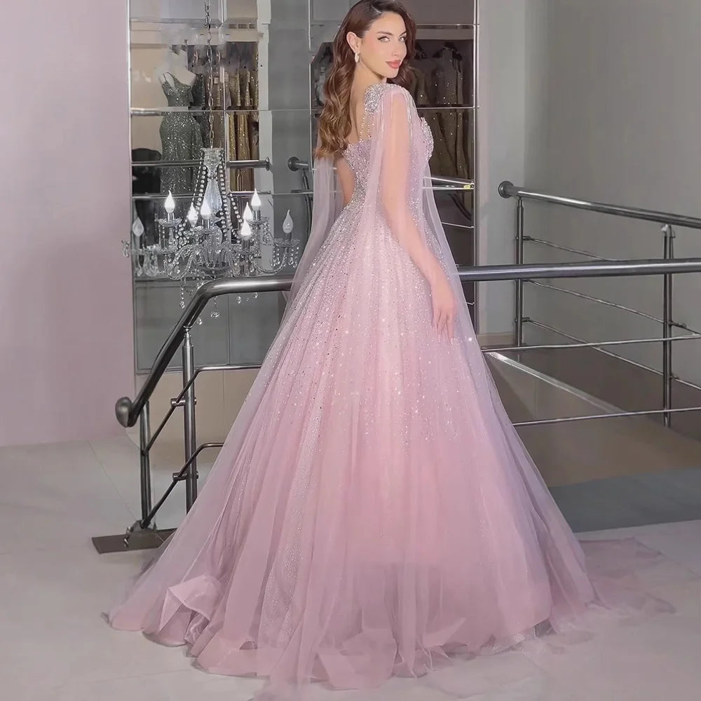 Luxury Pink Tulle Beaded A-Line Evening Dress with Cape Sleeves LA73072