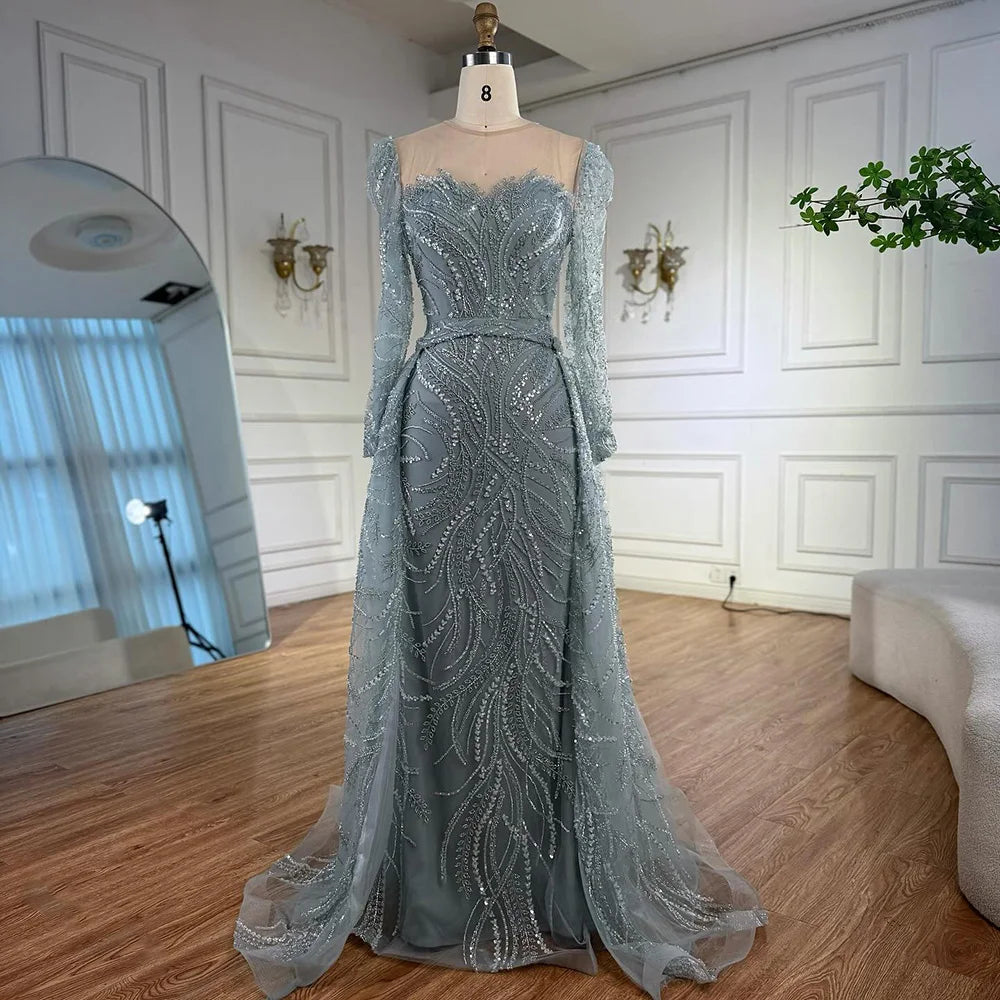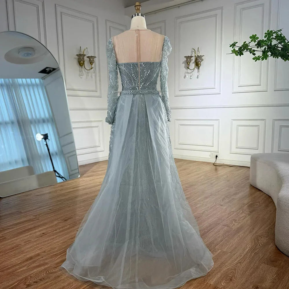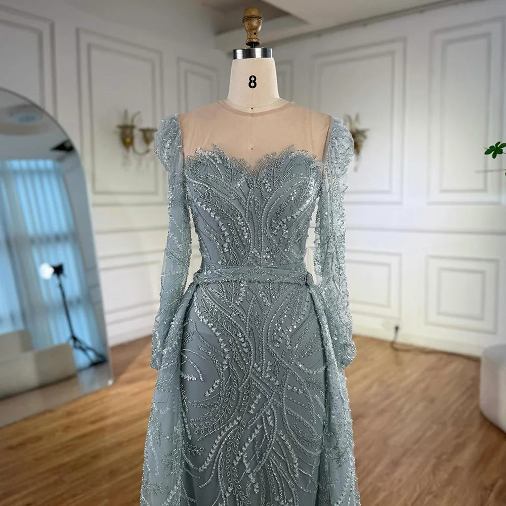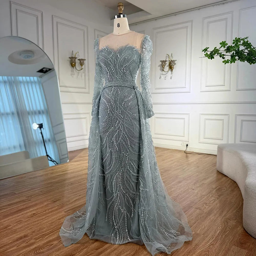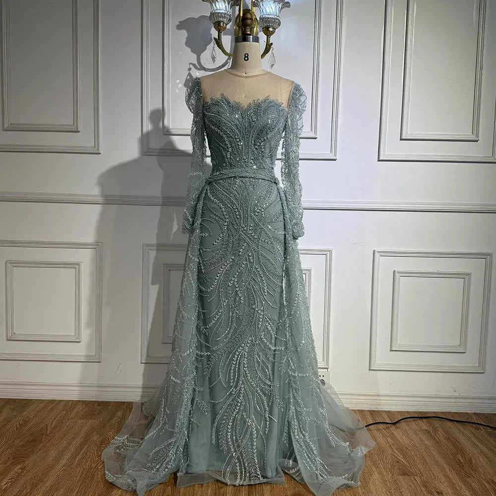 Luxury Sage Green Beaded Evening Dress with Detachable Overskirt LA73066
