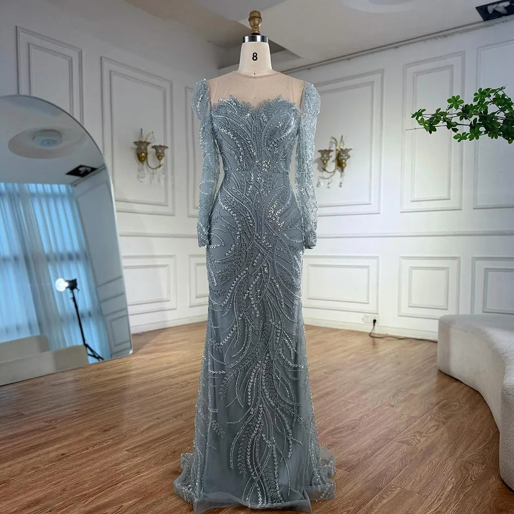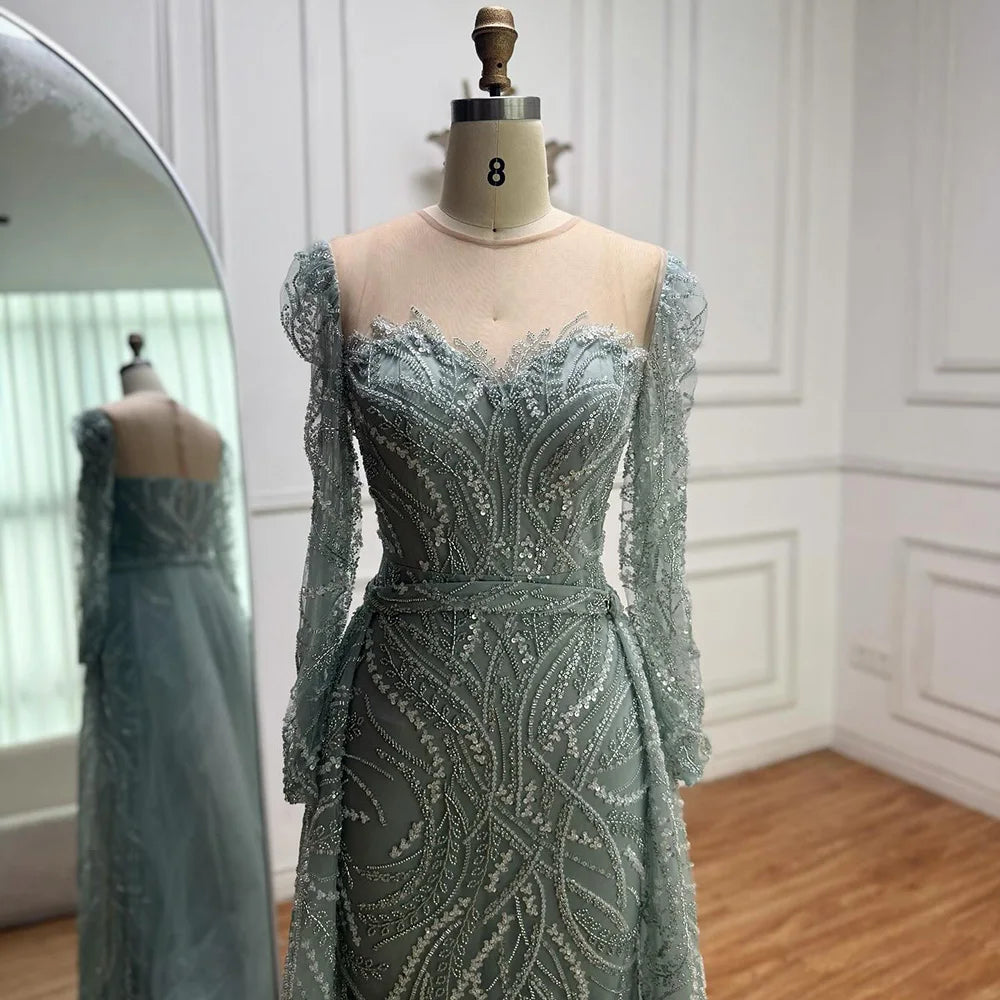 Elegant sage green Arabic-style evening gown with long sleeves, beading, and dramatic cape overskirt. Ideal for weddings, galas, and formal events.