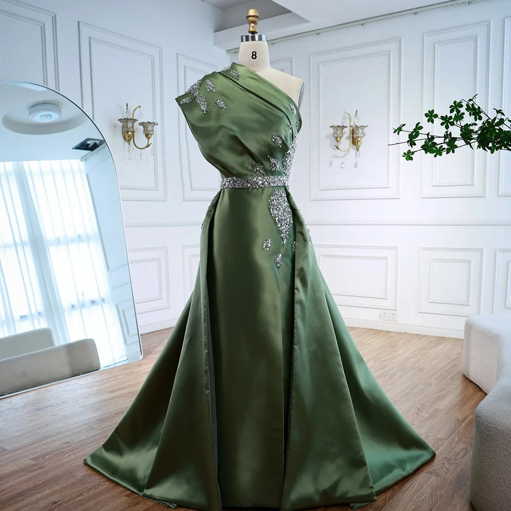 Luxury Dark Green Satin Beaded One Shoulder Evening Dress LA72845