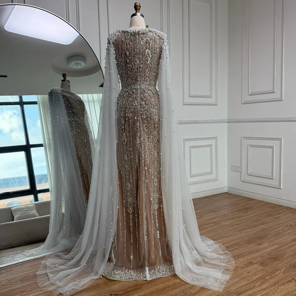 Luxury White Nude Mermaid Pearls Beaded Evening Dress with Cape Sleeves LA72444