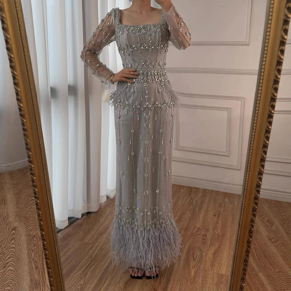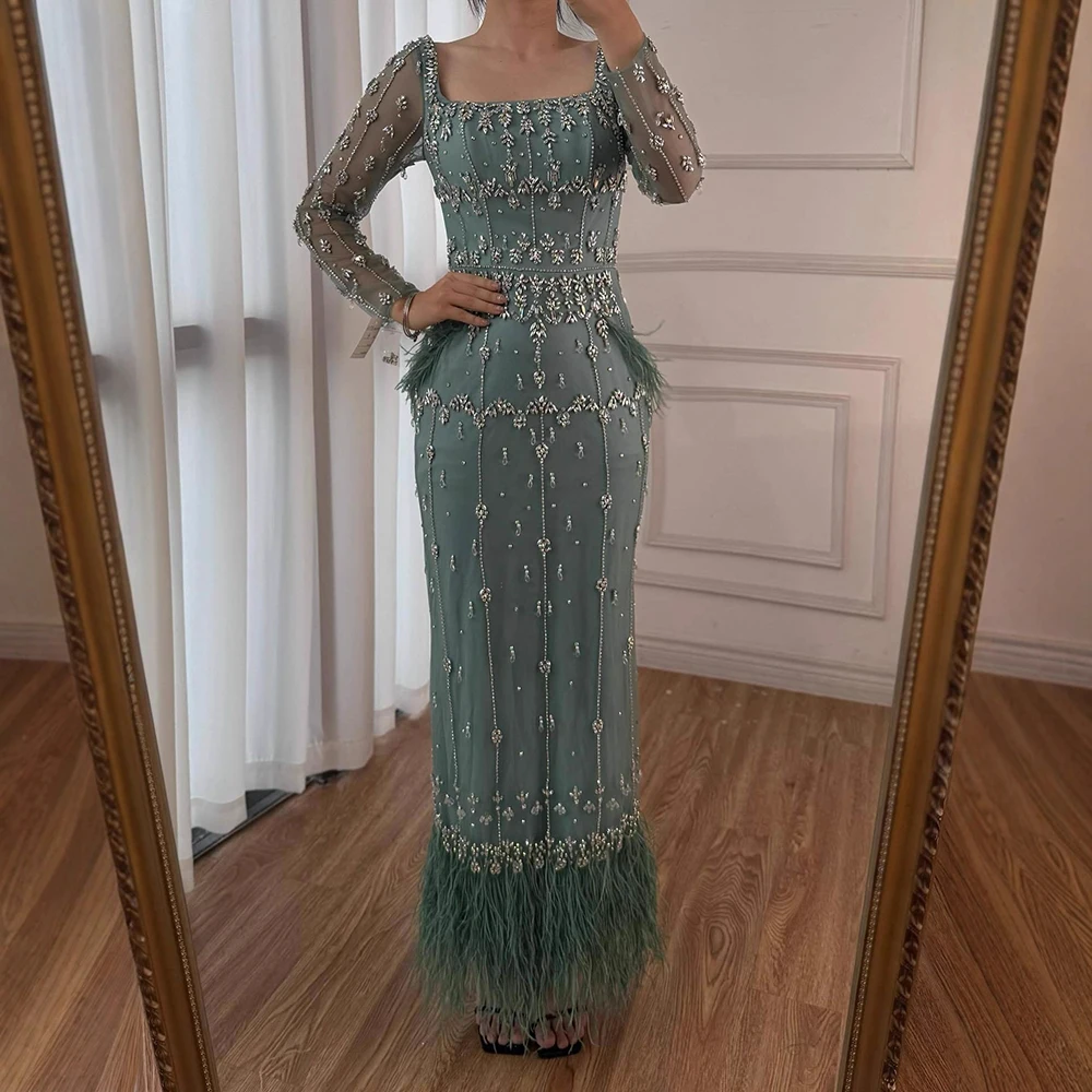 Muslim Luxury Feather Ankle Evening Dress with Long Sleeves LA71722