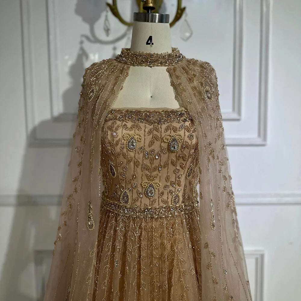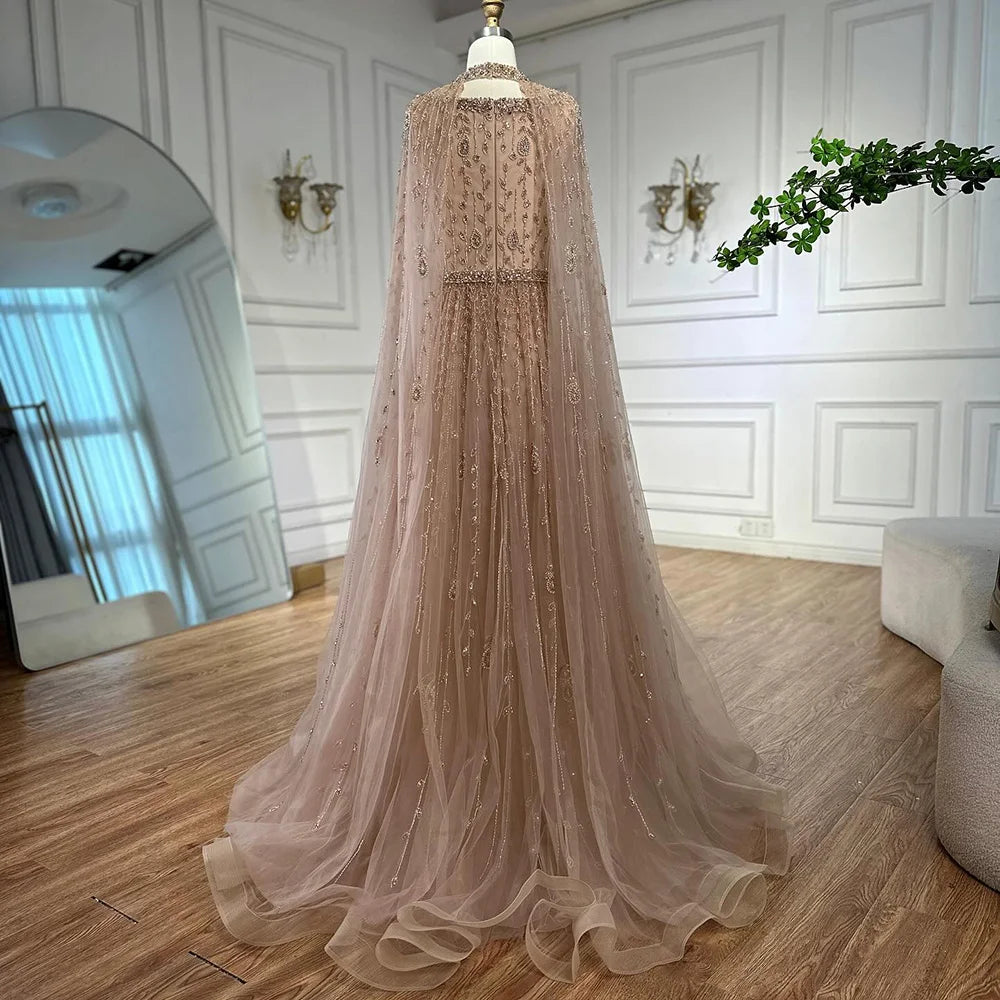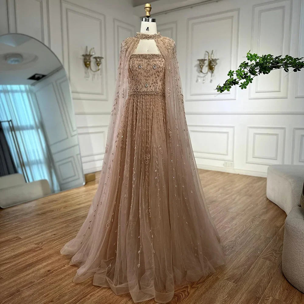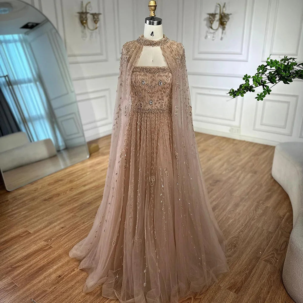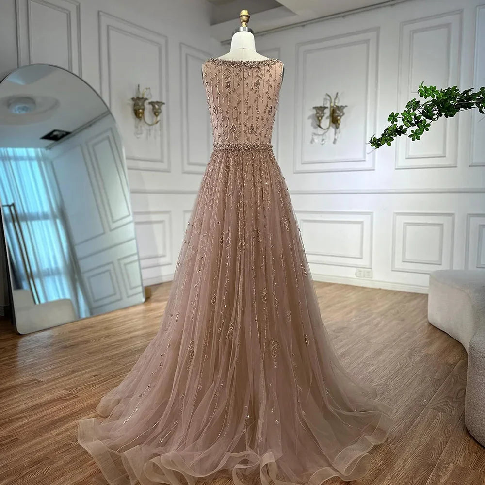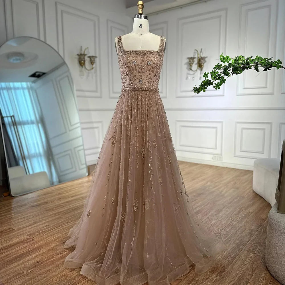 Elegant nude A-line evening dress with square neckline and delicate beading. A refined choice for Saudi Arabic formal occasions, galas, or weddings.