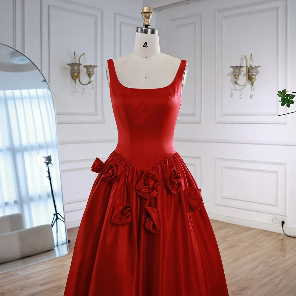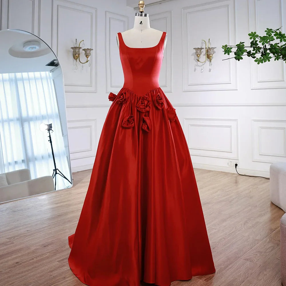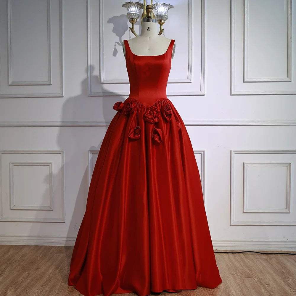 Stunning red A-line evening dress with 3D flowers, sleeveless and backless. Ideal for formal occasions, galas, or weddings.