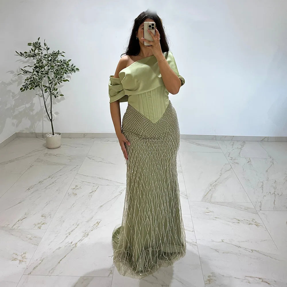 Elegant sage green fishtail evening dress with off-shoulder neckline and sparkling beadwork. Perfect for formal parties, galas, and wedding occasions.