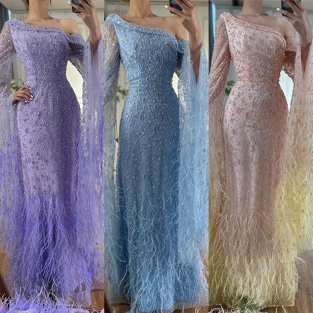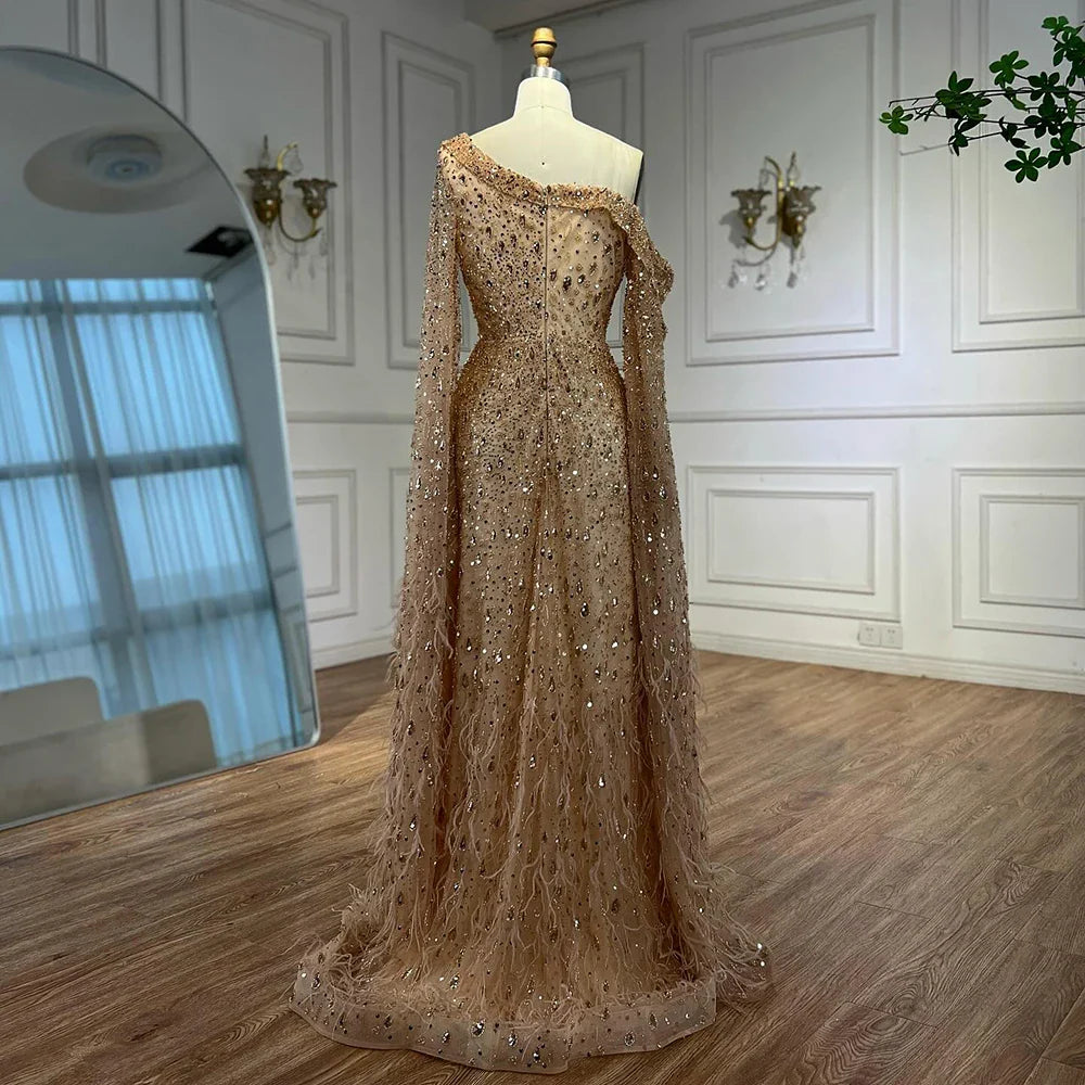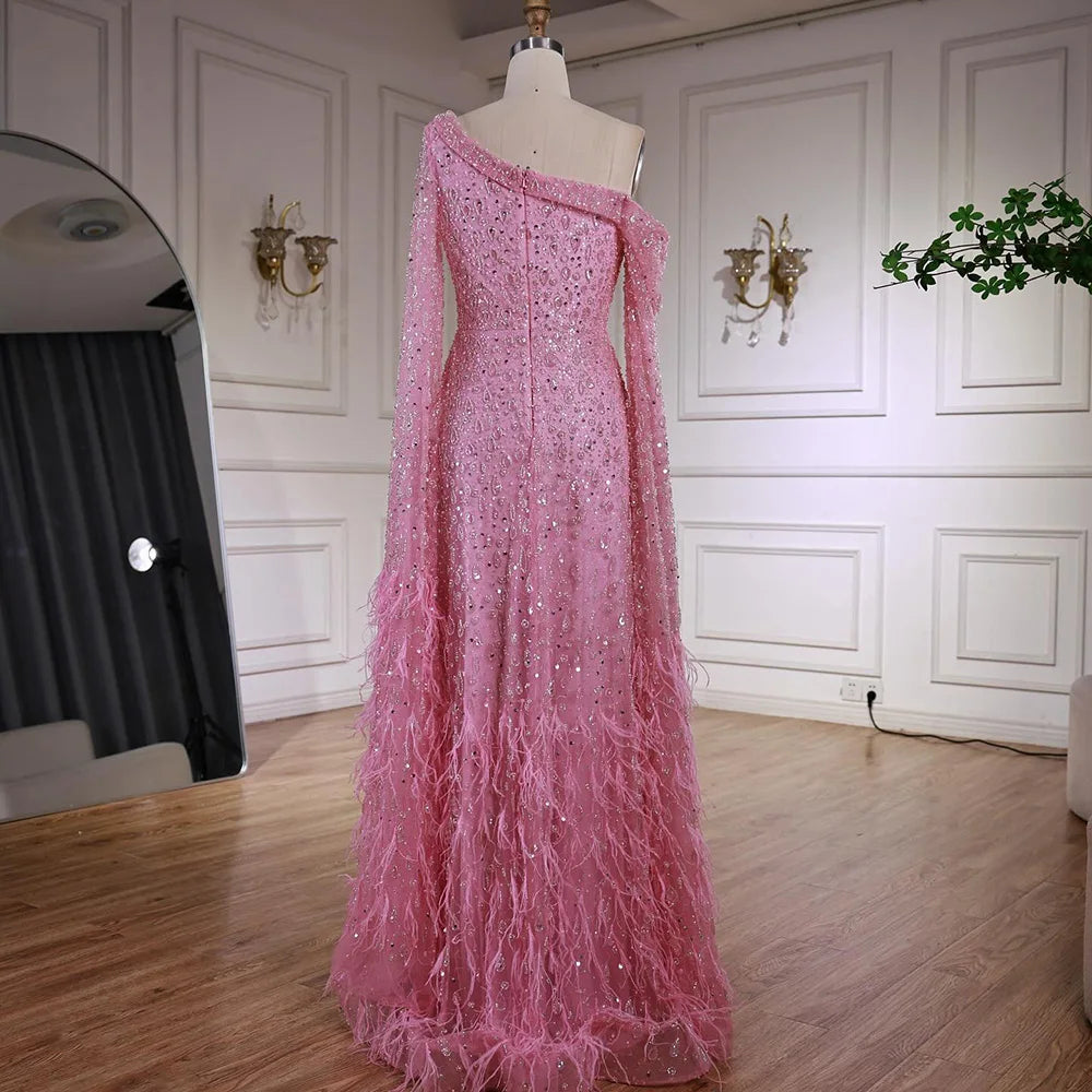 Luxury Feather One Shoulder Evening Dress with Cape Sleeves LA72763
