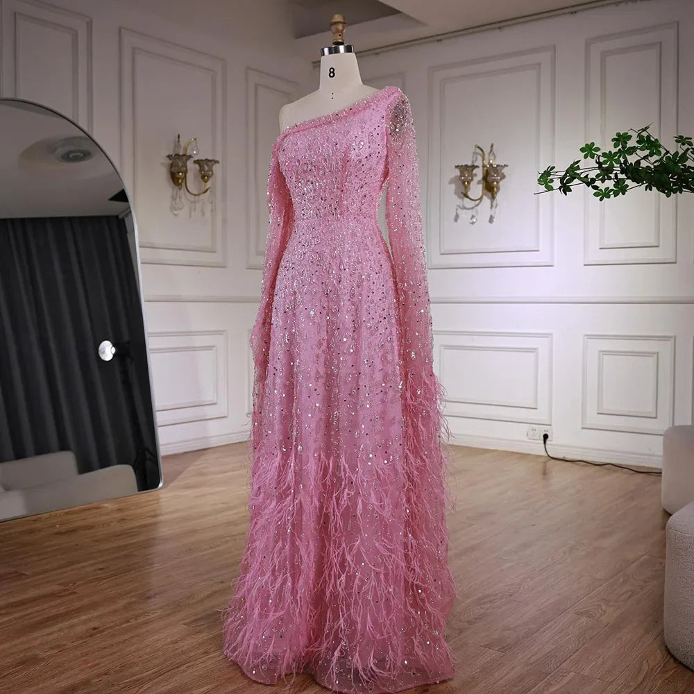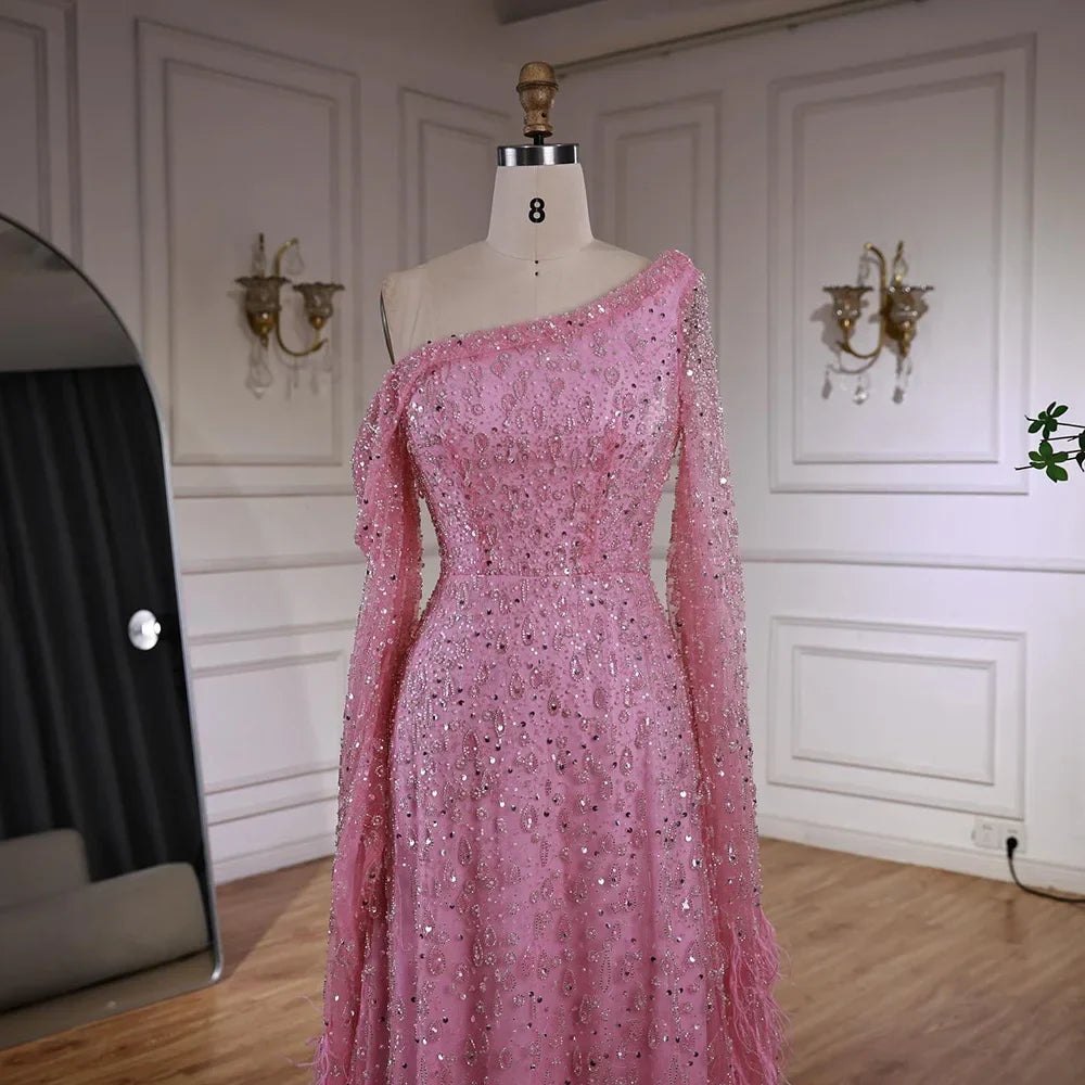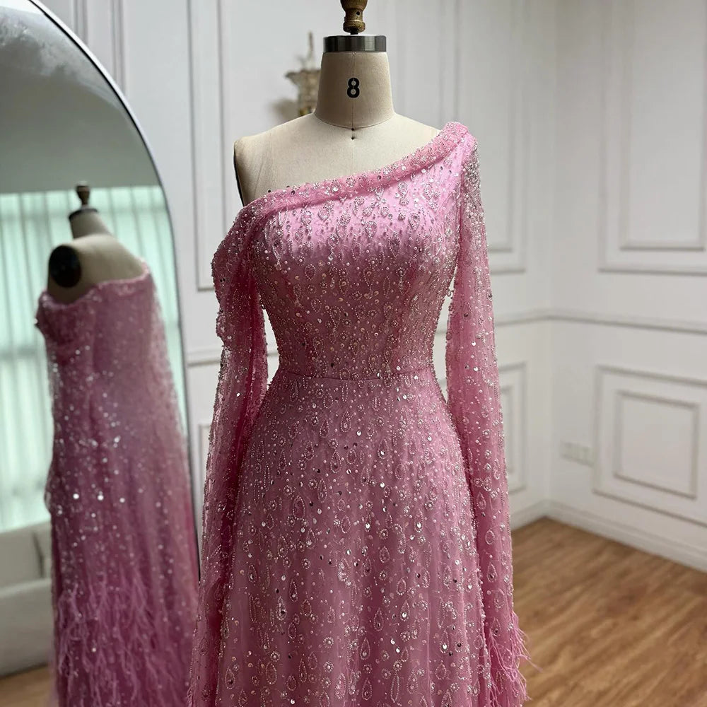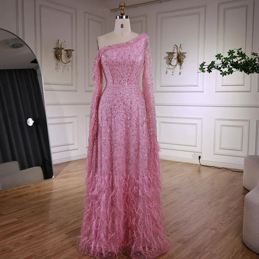Luxury Feather One Shoulder Evening Dress with Cape Sleeves LA72763