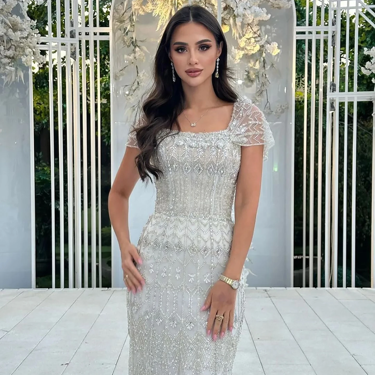 Luxury White Mermaid Square Neck Short Sleeves Evening Dresses LA72714