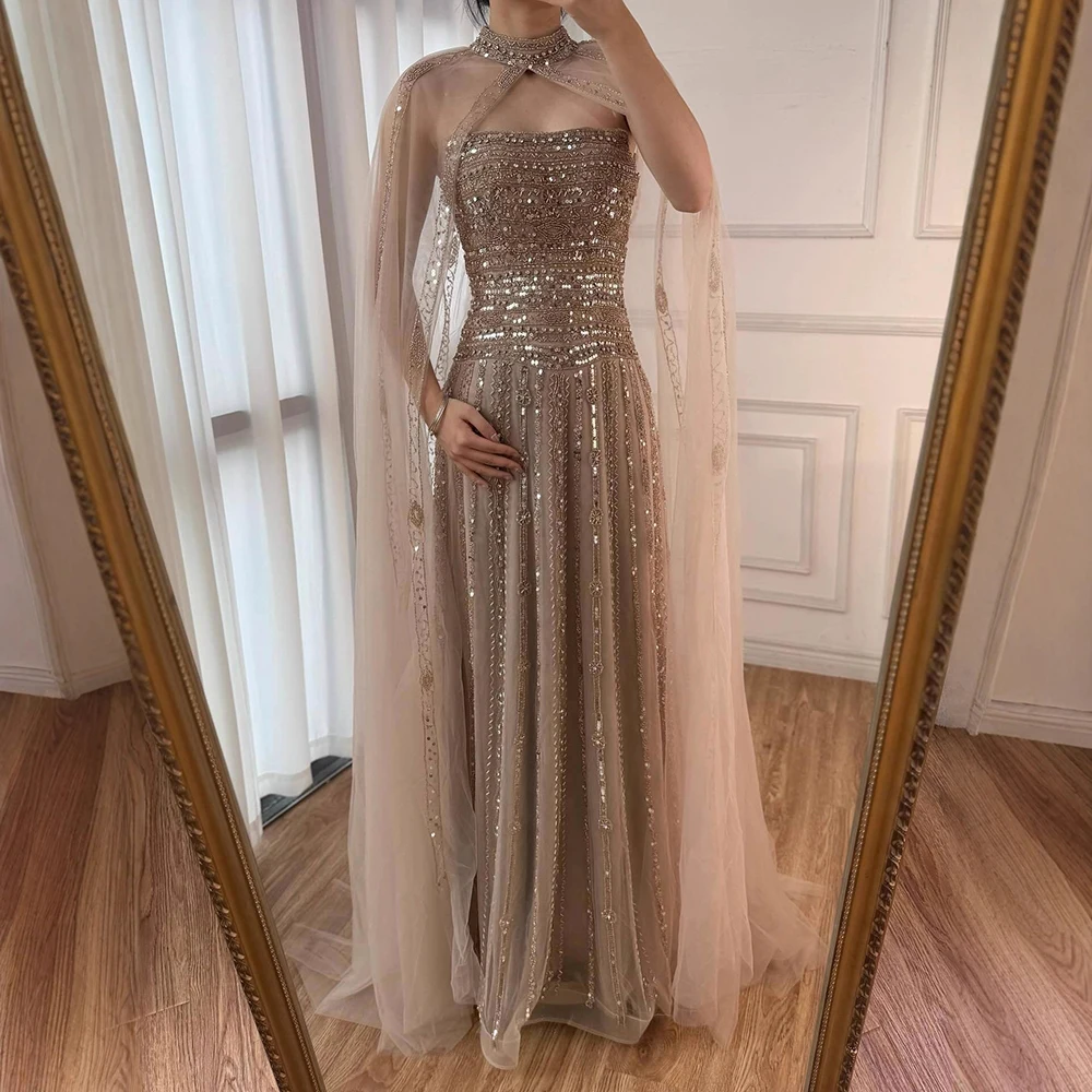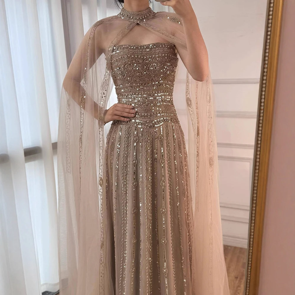 Luxury Caramel A-Line Beaded Evening Dress for Dubai Occasion LA72873