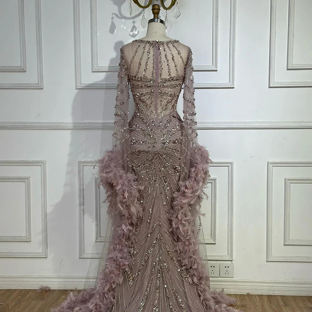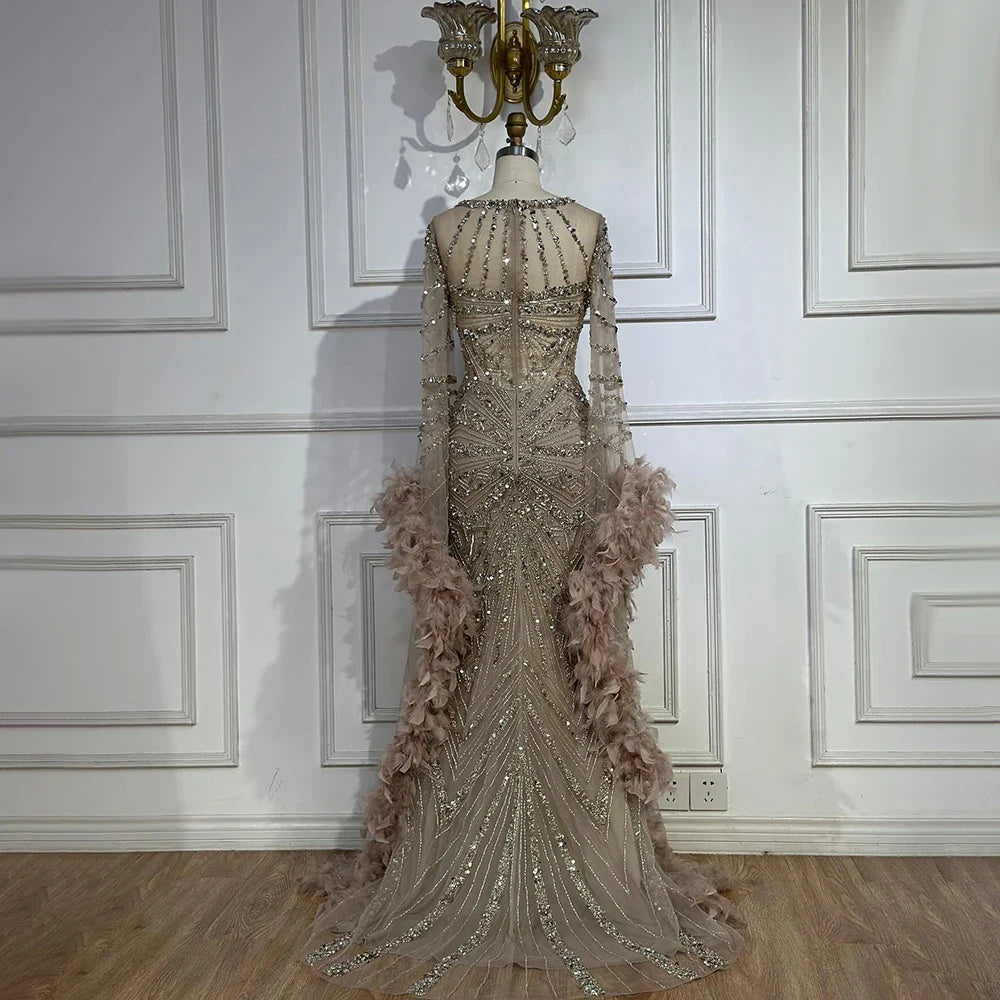 Indulge in luxury and elegance with our LA72708A dress. This gorgeous piece features stunning feather details, a chic nude color, and long sleeves for a touch of modesty. With its mermaid silhouette, you'll feel like a true beauty in this dress.