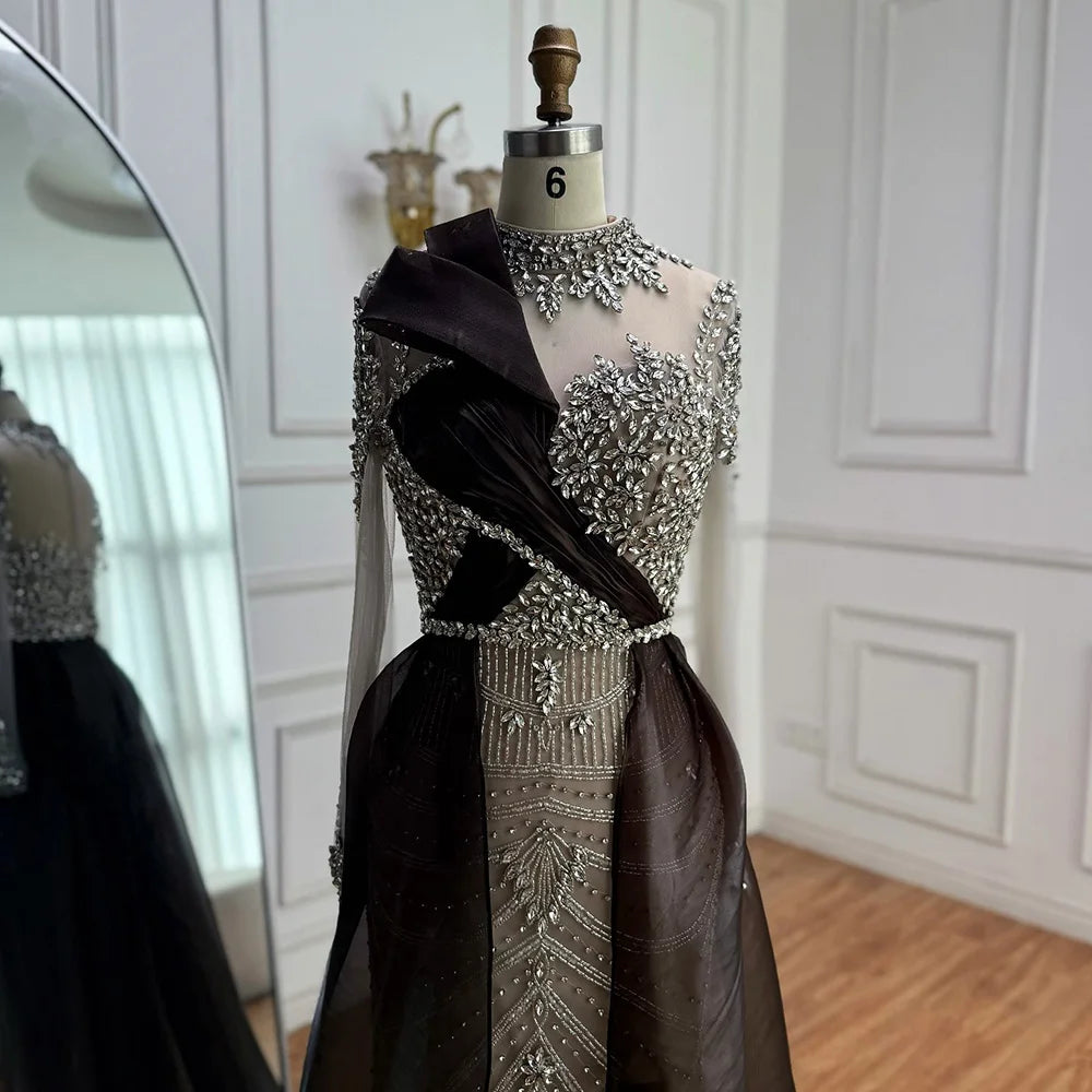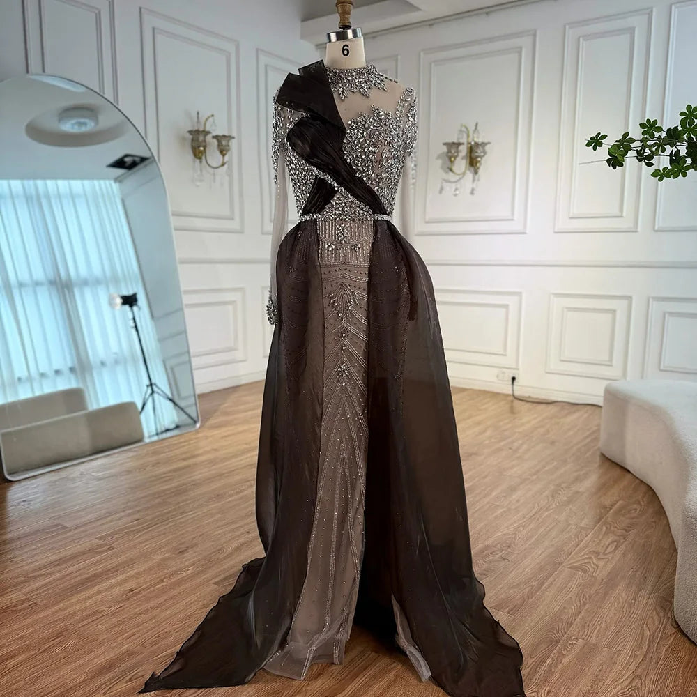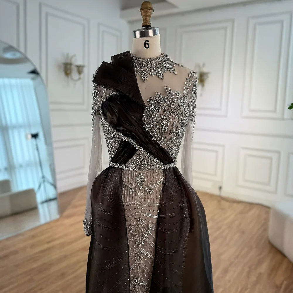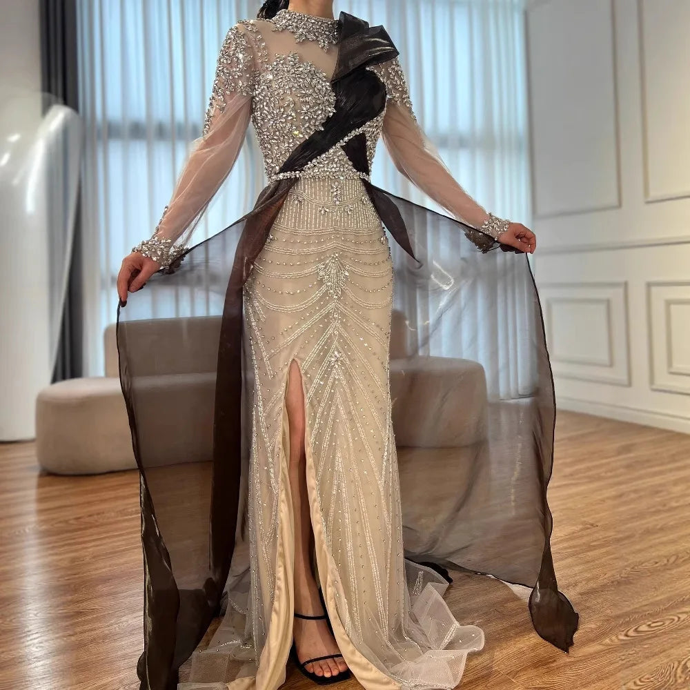 Elegant Arabic evening gown in silver nude with full beading and long sleeves. Perfect for formal events and custom-made for standout style.