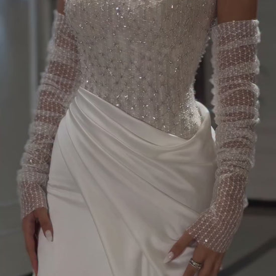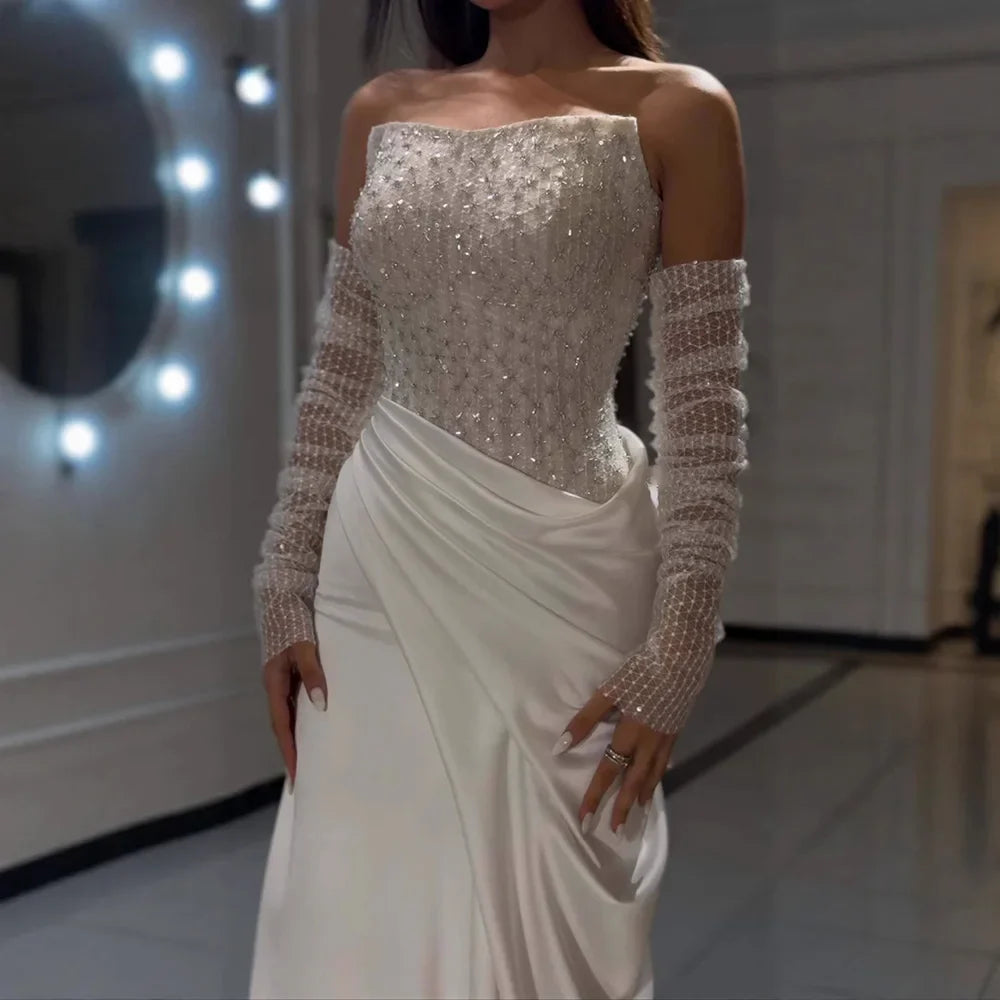Elegant white Strapless evening dress with beaded details and detachable sleeves. Perfect for weddings, formal parties, and red carpet events.
