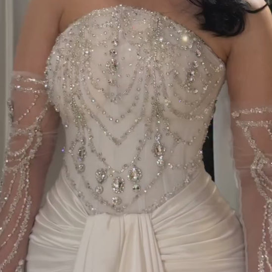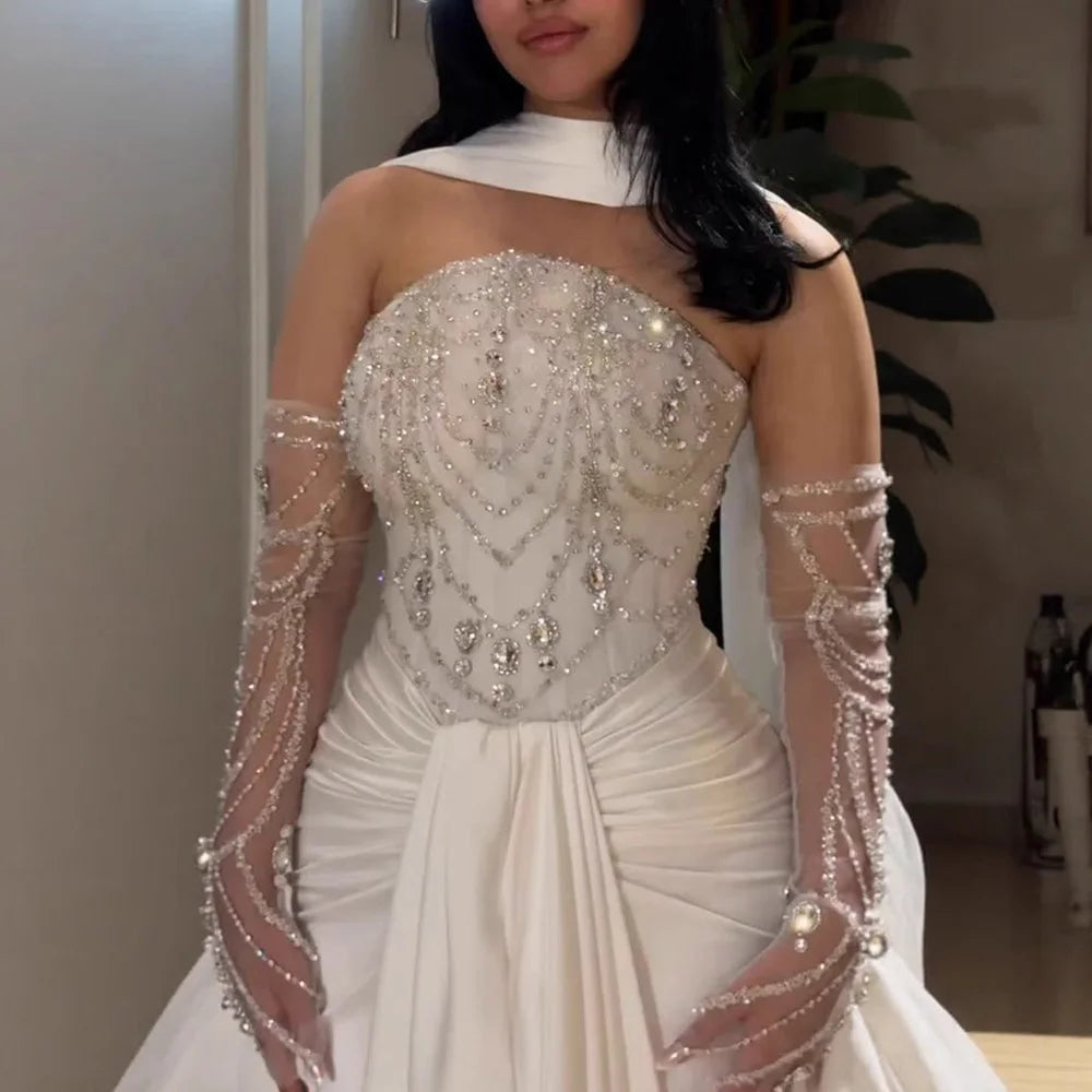 Elegant white strapless evening gown with beaded detailing and detachable gloves. A perfect choice for weddings, proms, and upscale parties.