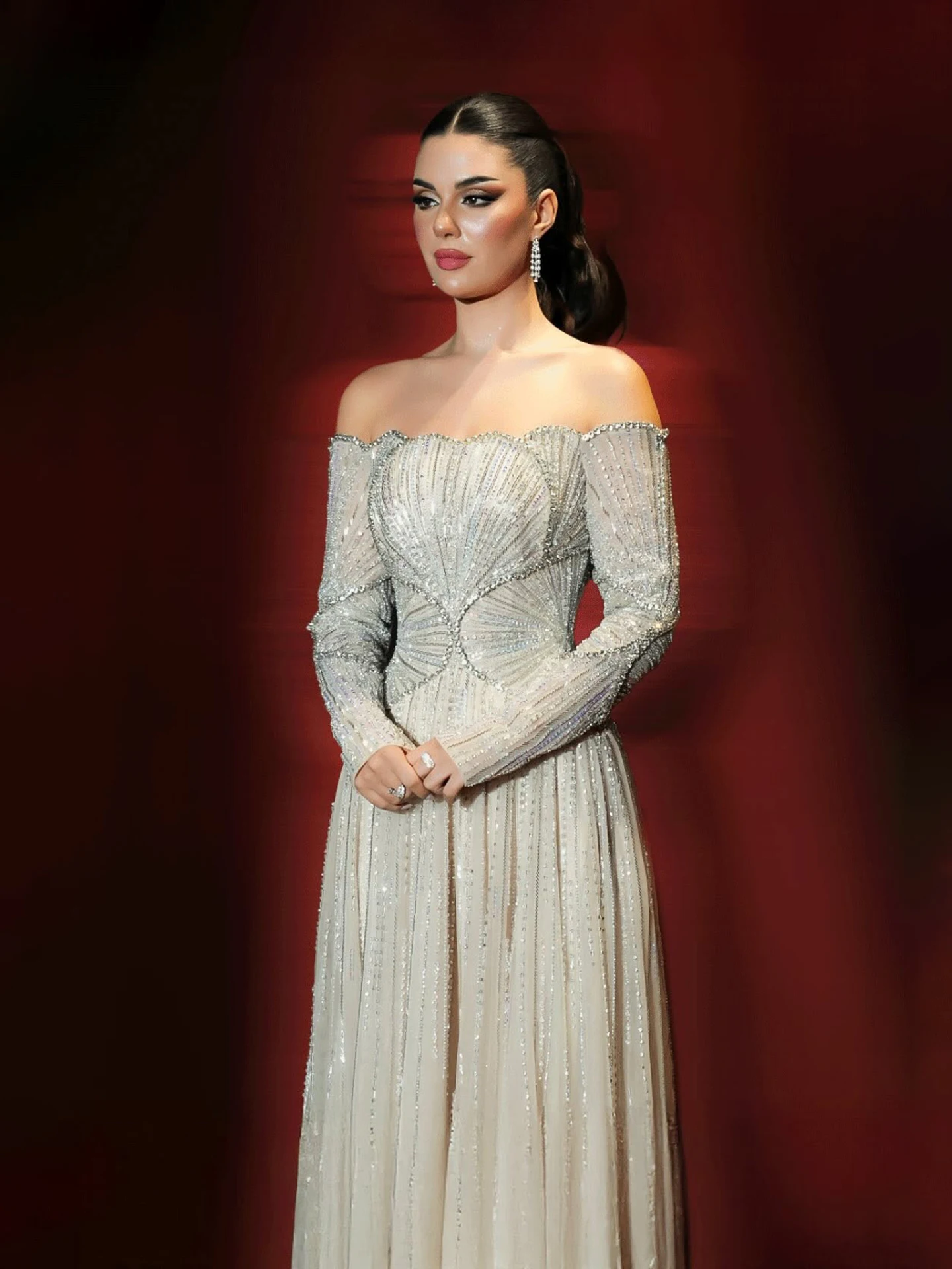 A Luxury Beige Arabic Dubai Famous Designer A-Line Evening Dress Designed For Wedding Parties And Formal Occasions. Model LA73333.