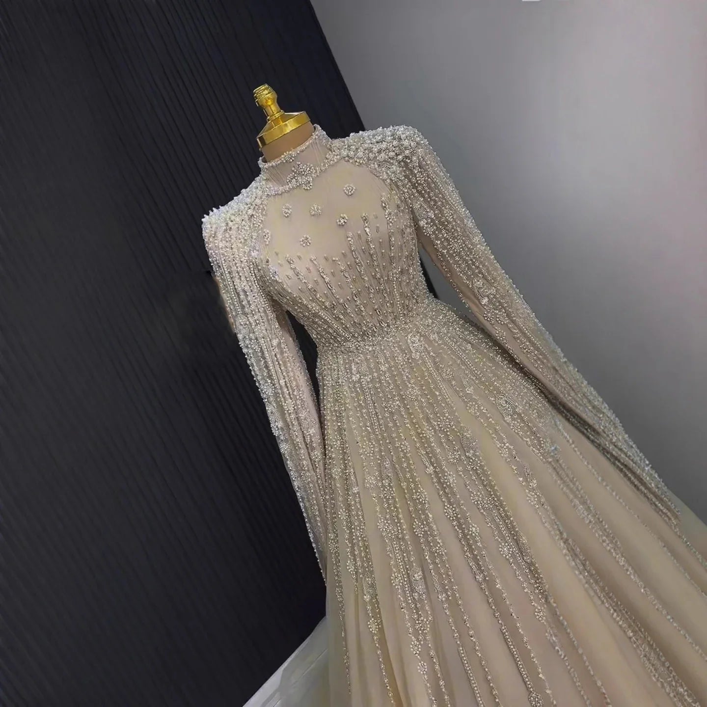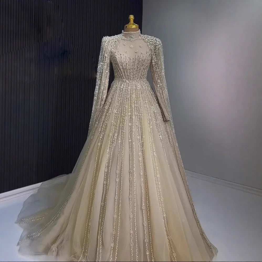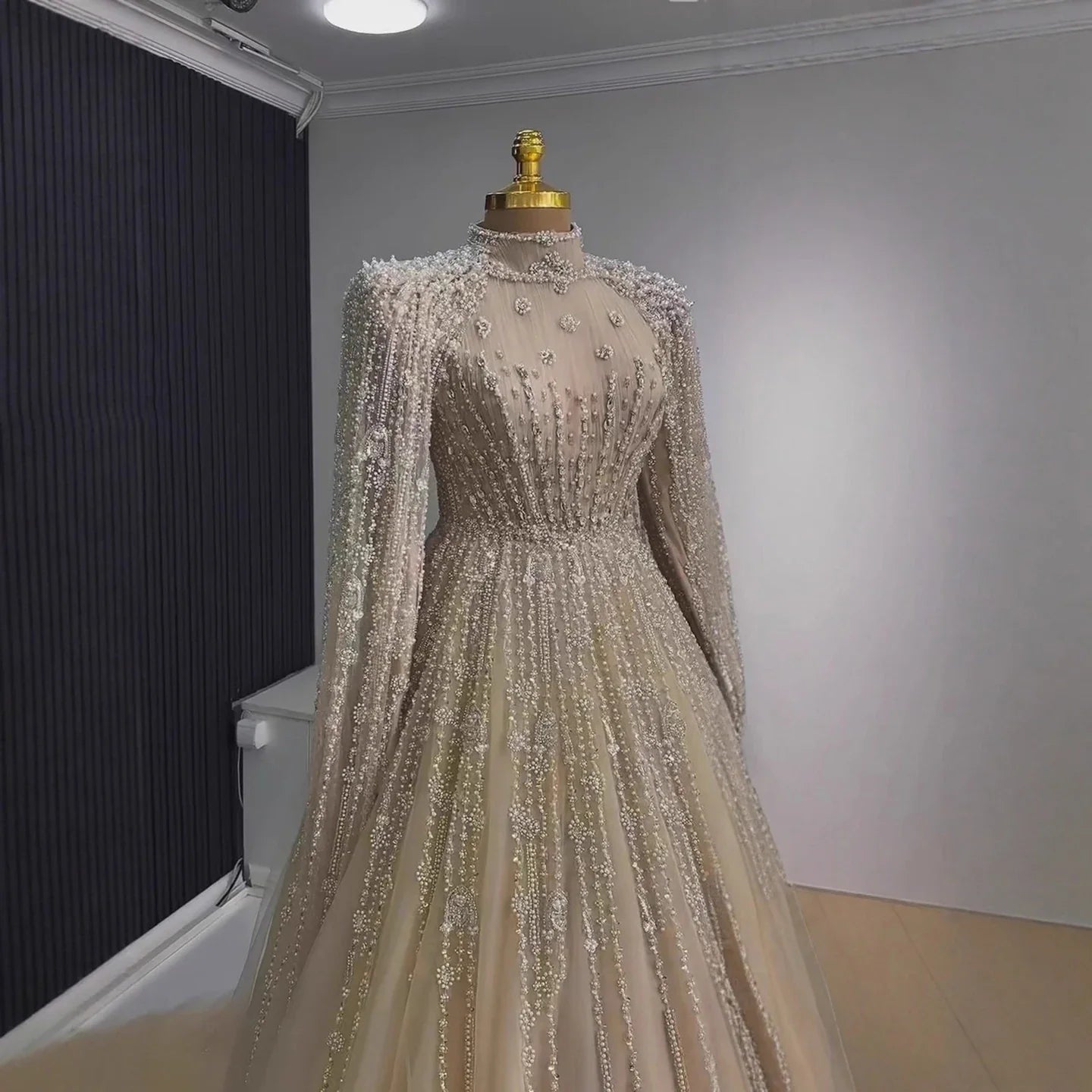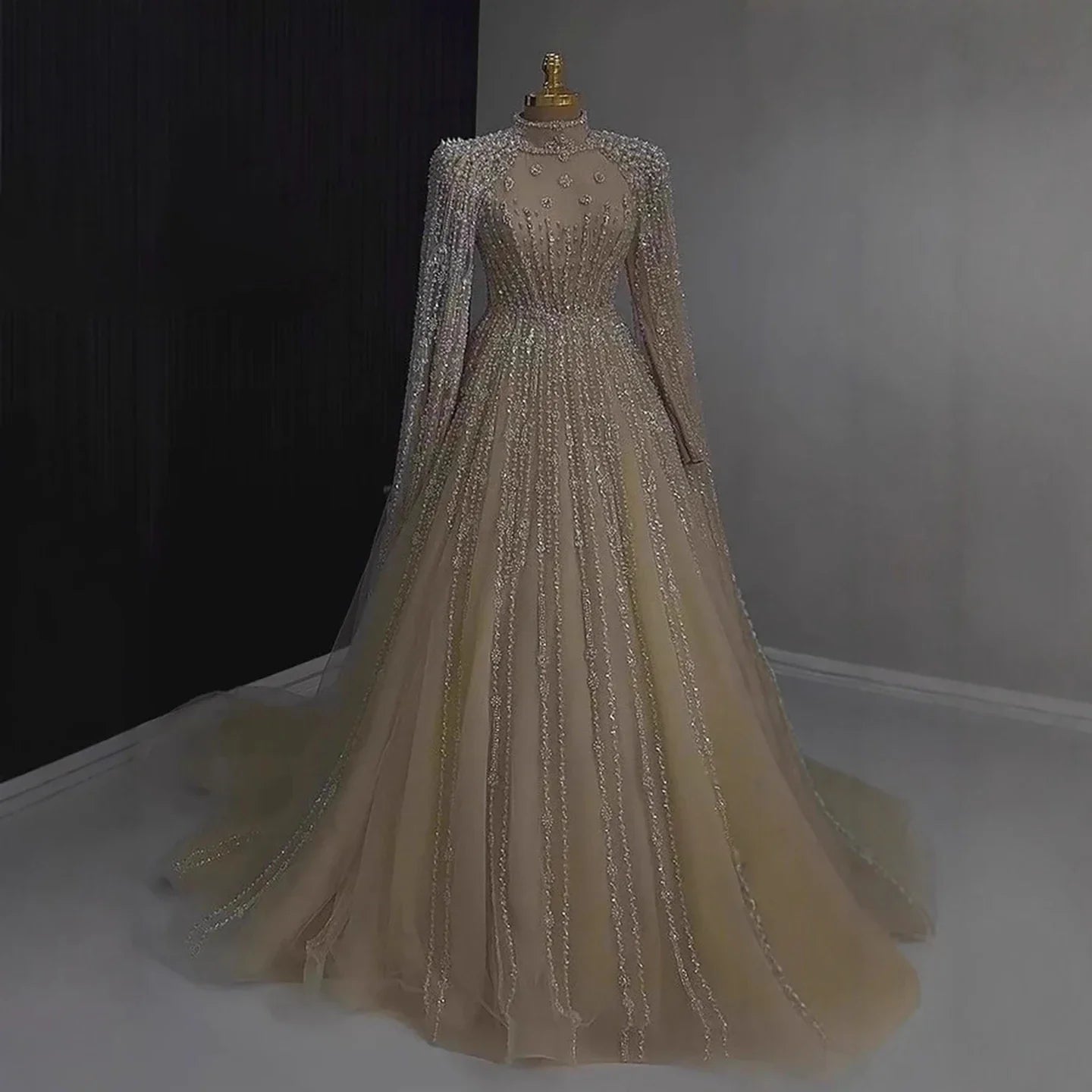 Luxury Nude Muslin Modest Beaded Evening Dress with Cape LA73271