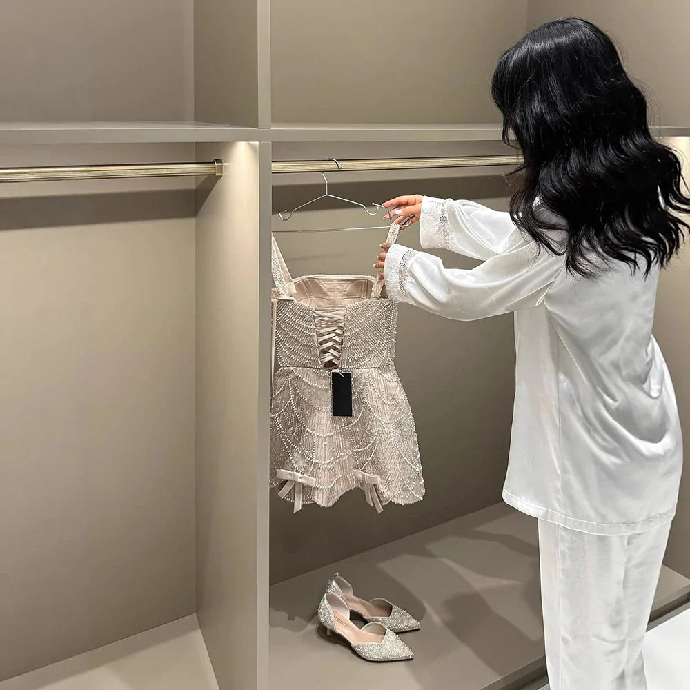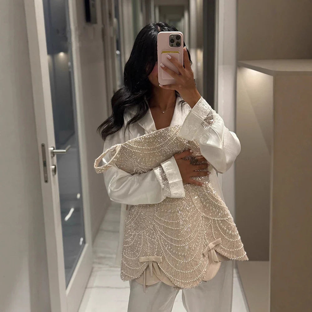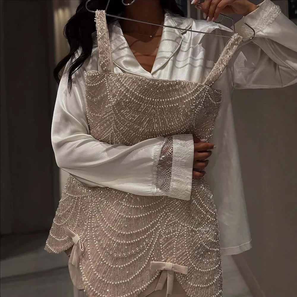 Luxury Nude Pearl Beaded A-Line Mini Evening Dress LA73211