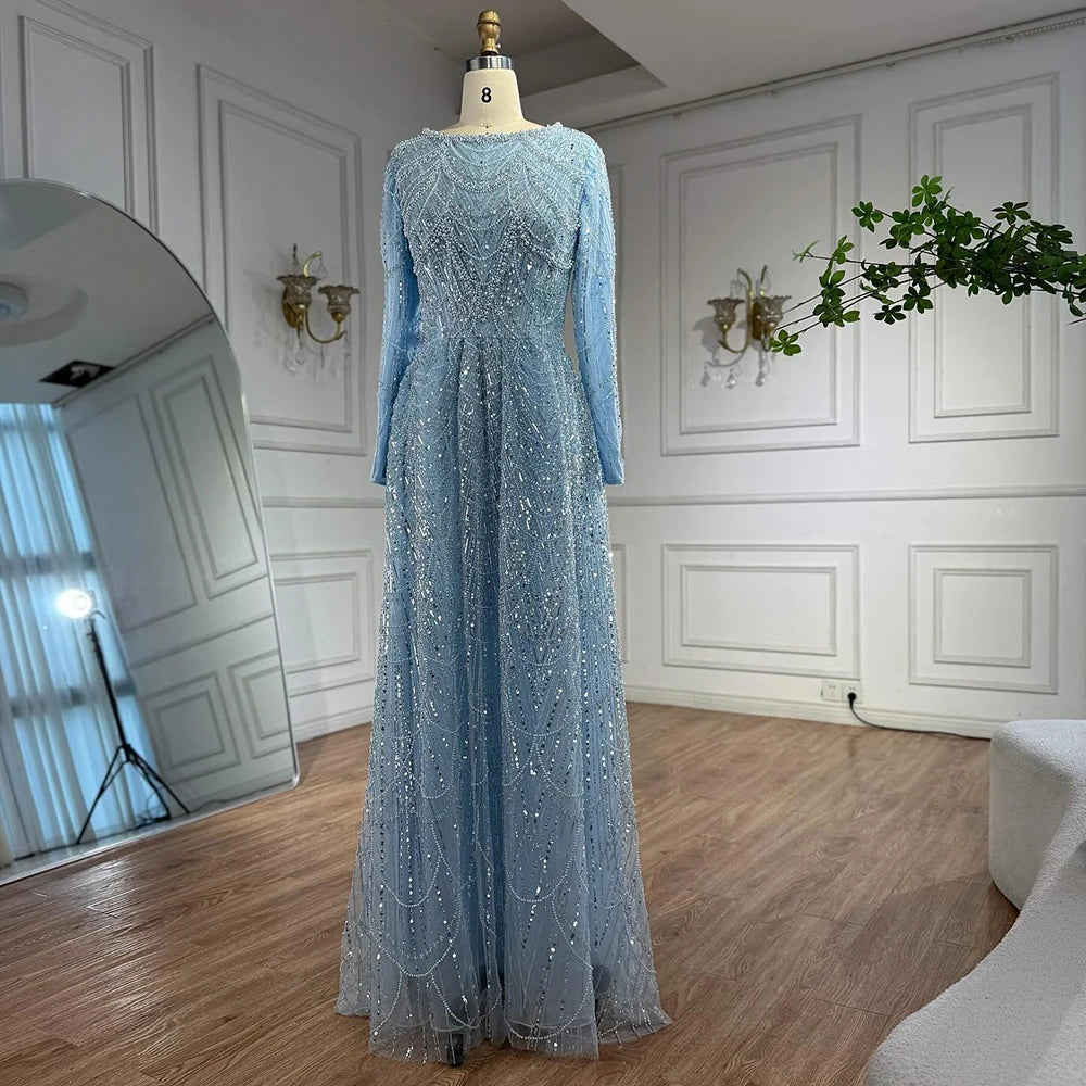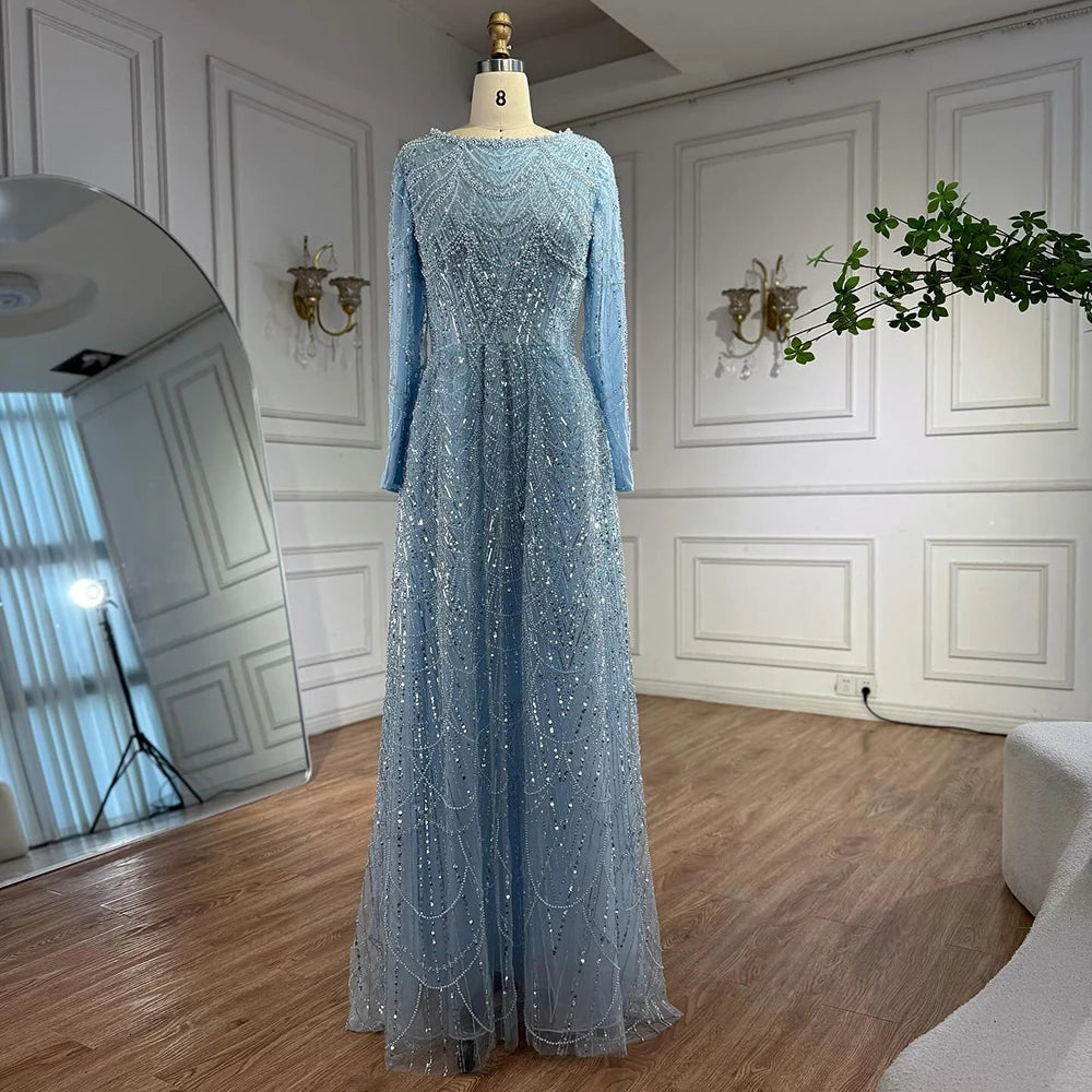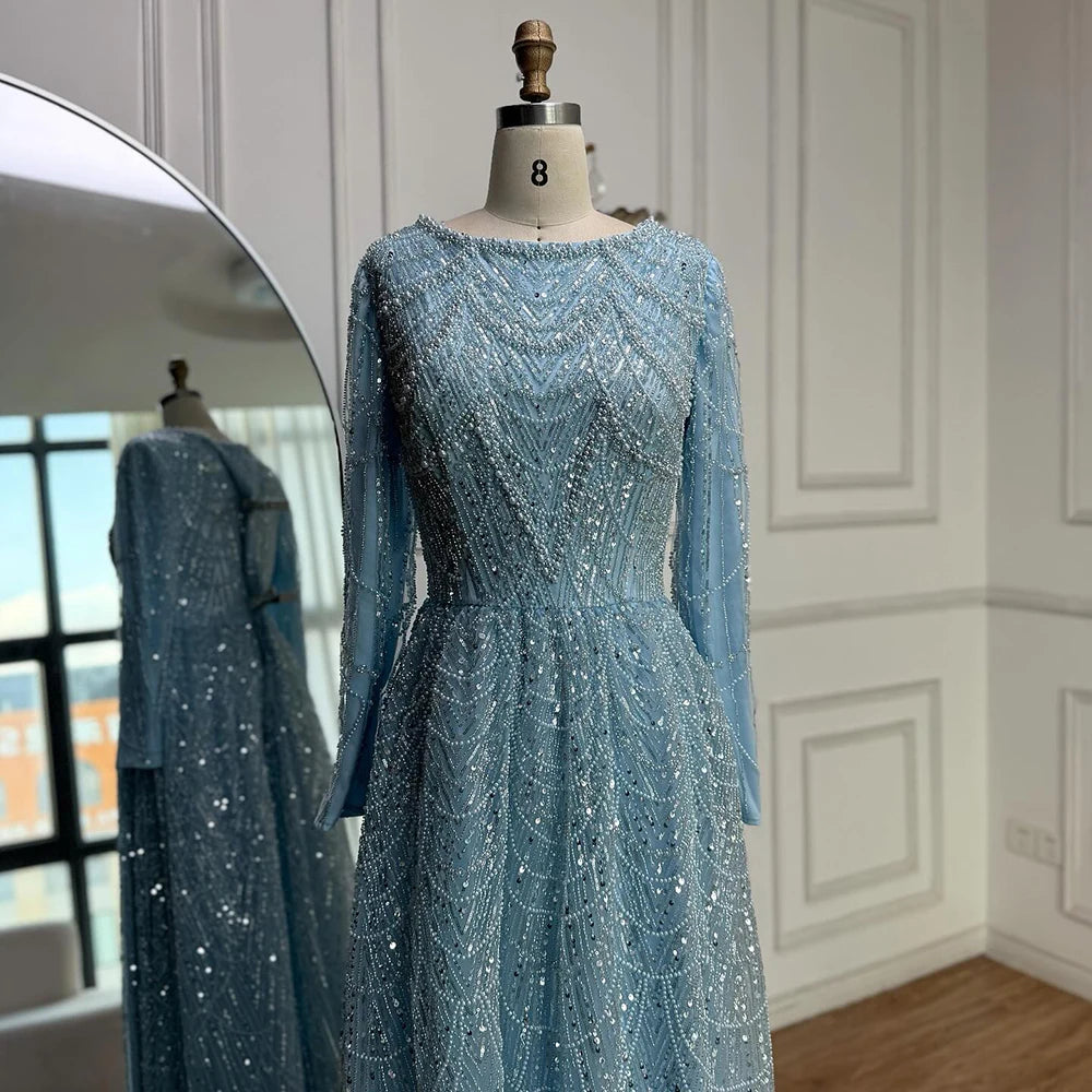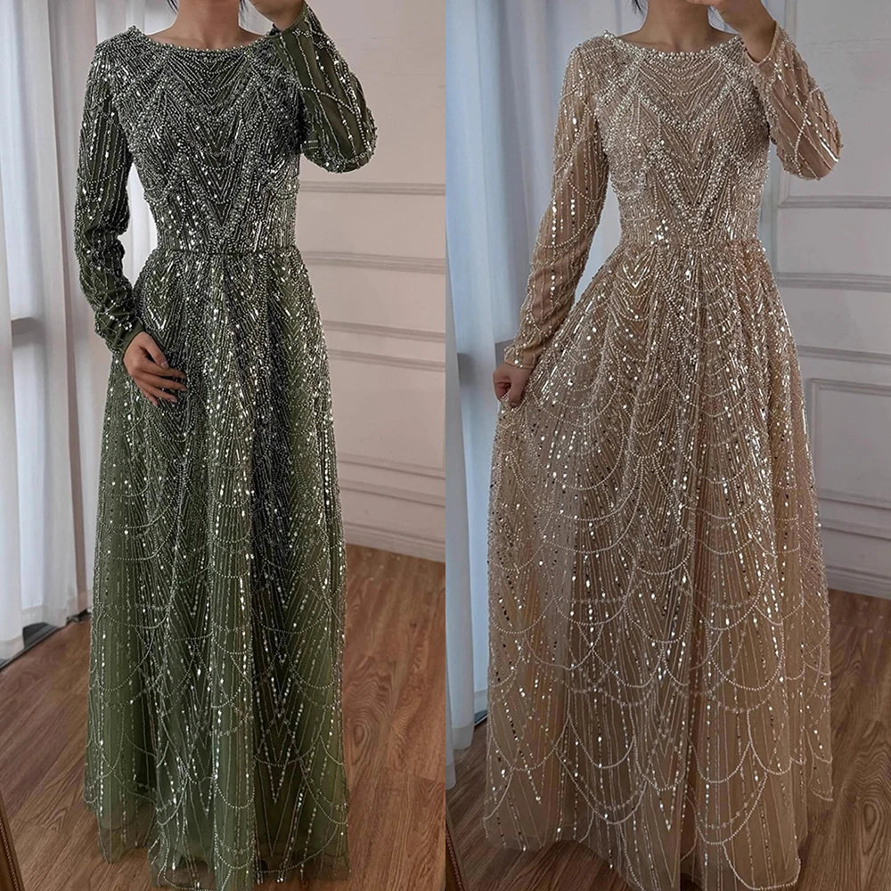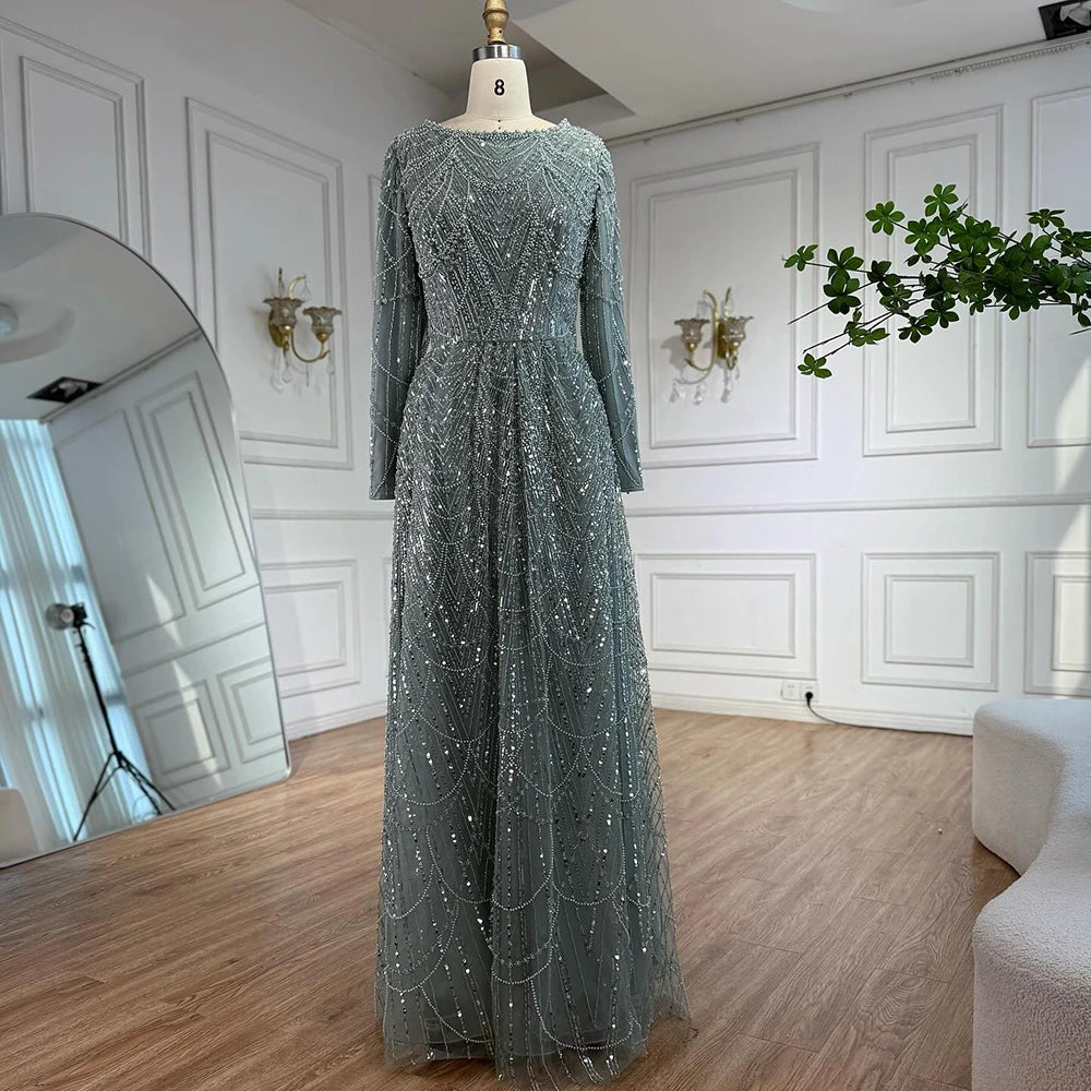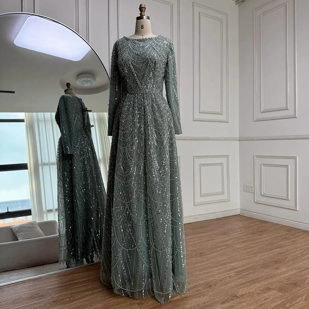 שמלת ערב יוקרתית בגזרת A עם חרוזים בצבע ירוק זית ושרוולים ארוכים LA72738B
