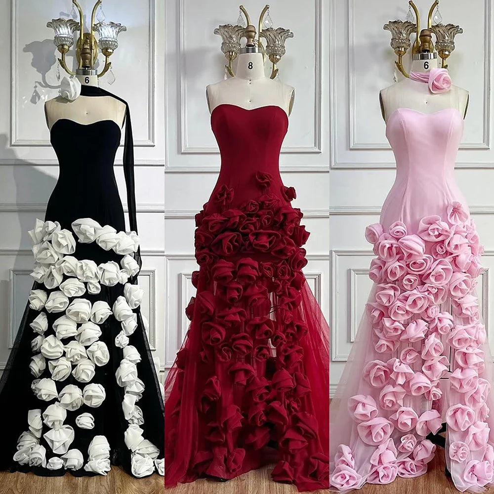 Elegant Evening Dress for Girls Arabic Pink 3D Flowers Elegant Srapless Dress Side Split Prom Party Gowns LA72568